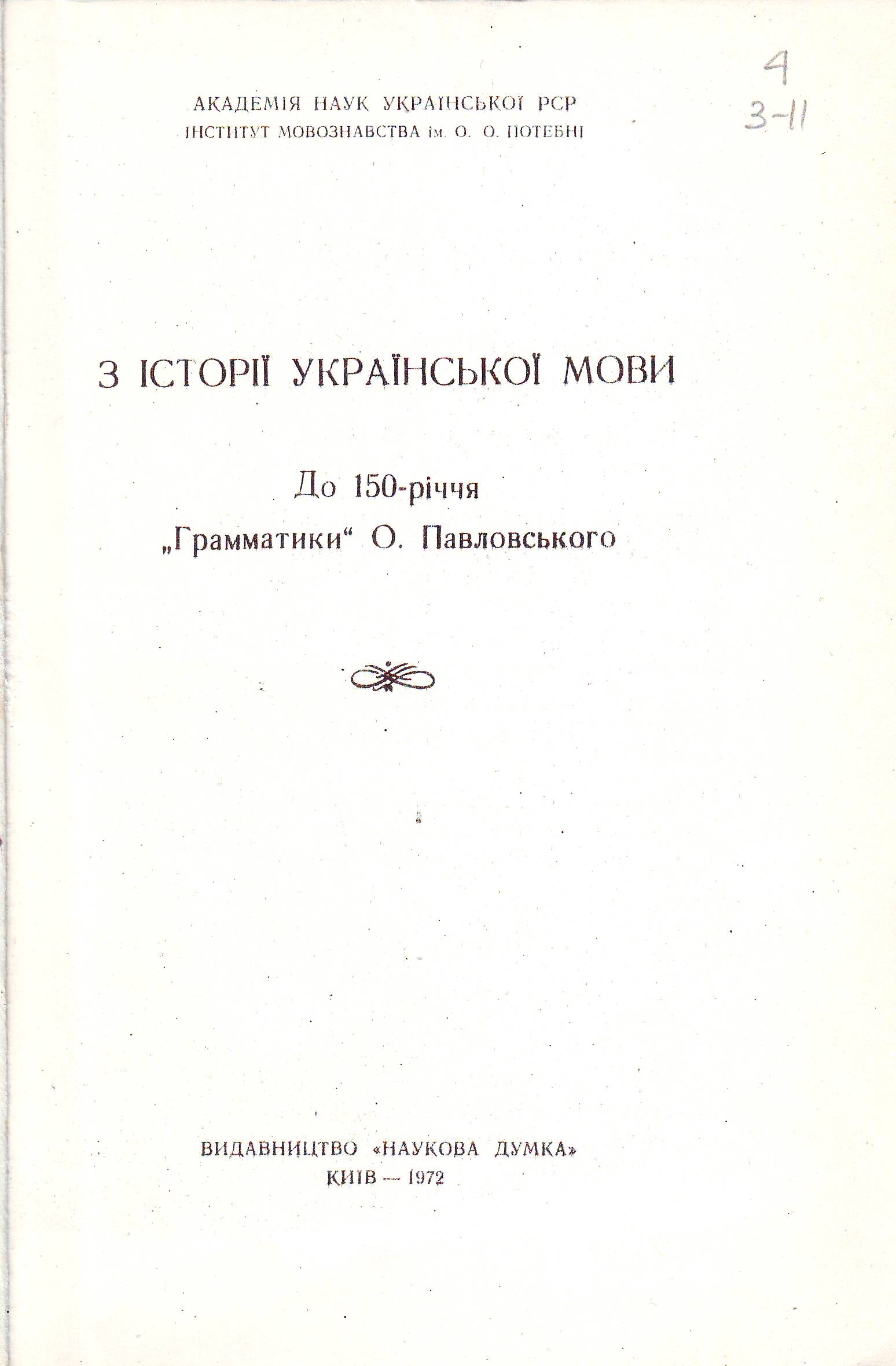 З історії української мови: до 150-річчя "Граматики" О. Павловського / АН Української РСР ; Ін-т мовознавства ім. О. О. Потебні. – К. : Наукова думка, 1972. – 115 с. Видання присвячене першій в історії українського мовознавства граматиці української мови, написаної О. Павловським на основі живої народної мови. Збірка містить статті, дослідження відомих українських мовознавців, таких як Б. Кобилянський, М. Жовтобрюх, В. Німчук та ін. |