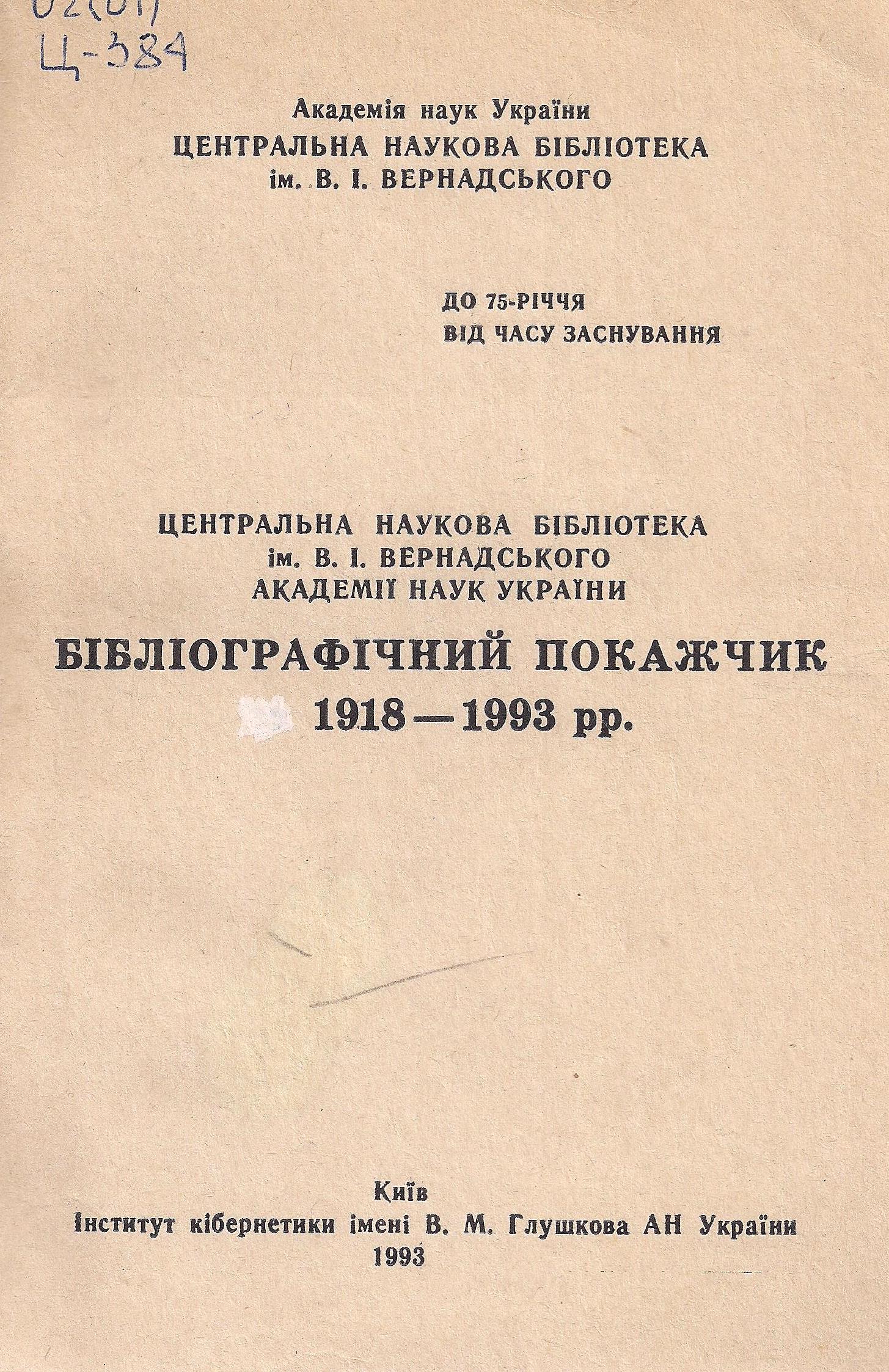 Центральна наукова бібліотека ім. В. І. Вернадського Академії наук України : бібліографічний покажчик, 1918-1993 рр. / АН України, Центральна наук. б-ка ім. В. І. Вернадського ; уклад.: І. Г. Шовкопляс, [та ін.] ; відп. ред.: О. С. Онищенко, В. Ю. Омельчук. – Київ : Ін-т кібернетики ім. В. М. Глушкова АН України, 1993. – 296 c.