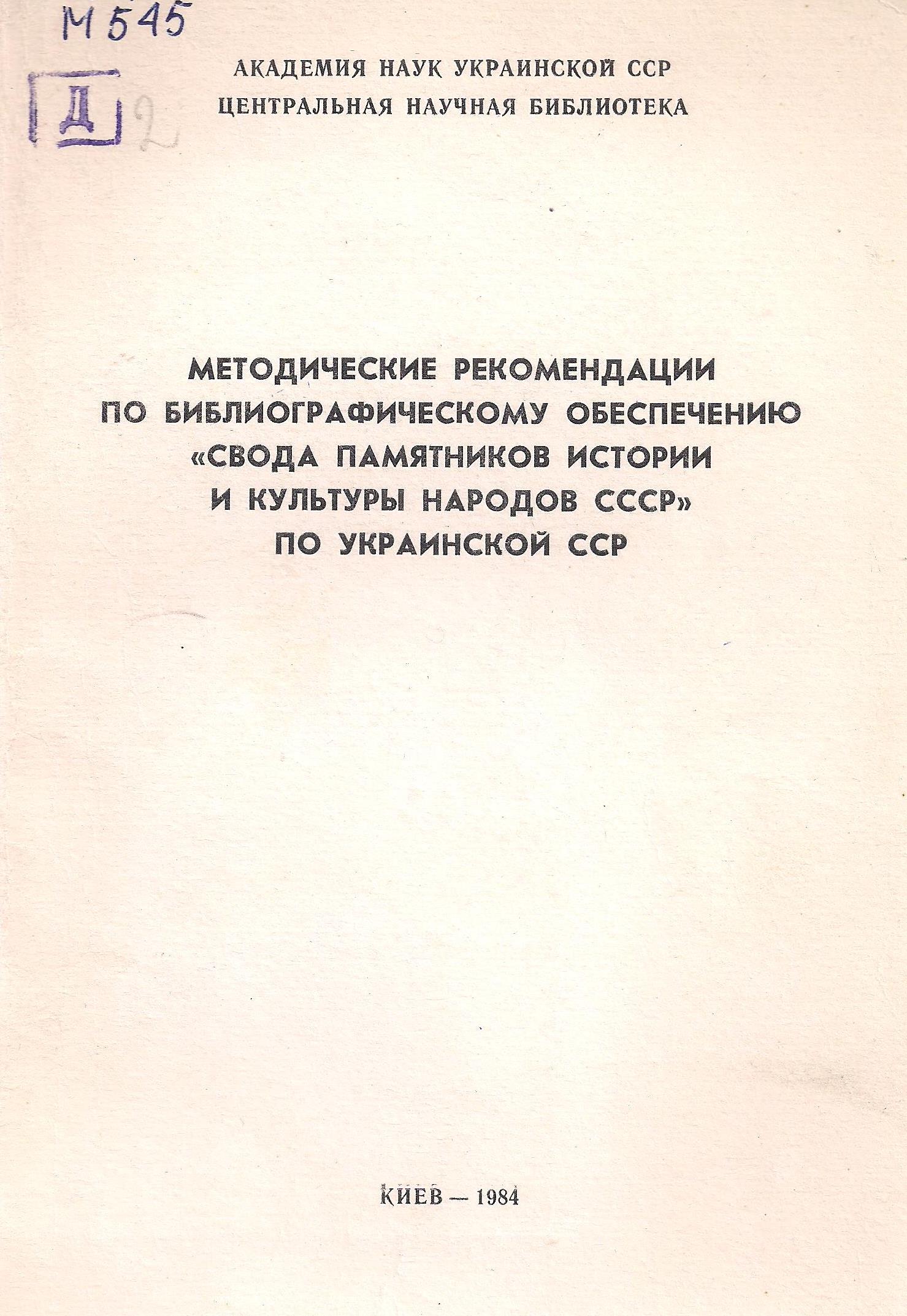 Методические рекомендации по библиографическому обеспечению «Свода памятников истории и культуры СССР» по Украинской ССР / Академия наук УССР, Центральная научная библиотека ; сост. И. Г. Шовкопляс. – Киев, 1984. – 106 с.