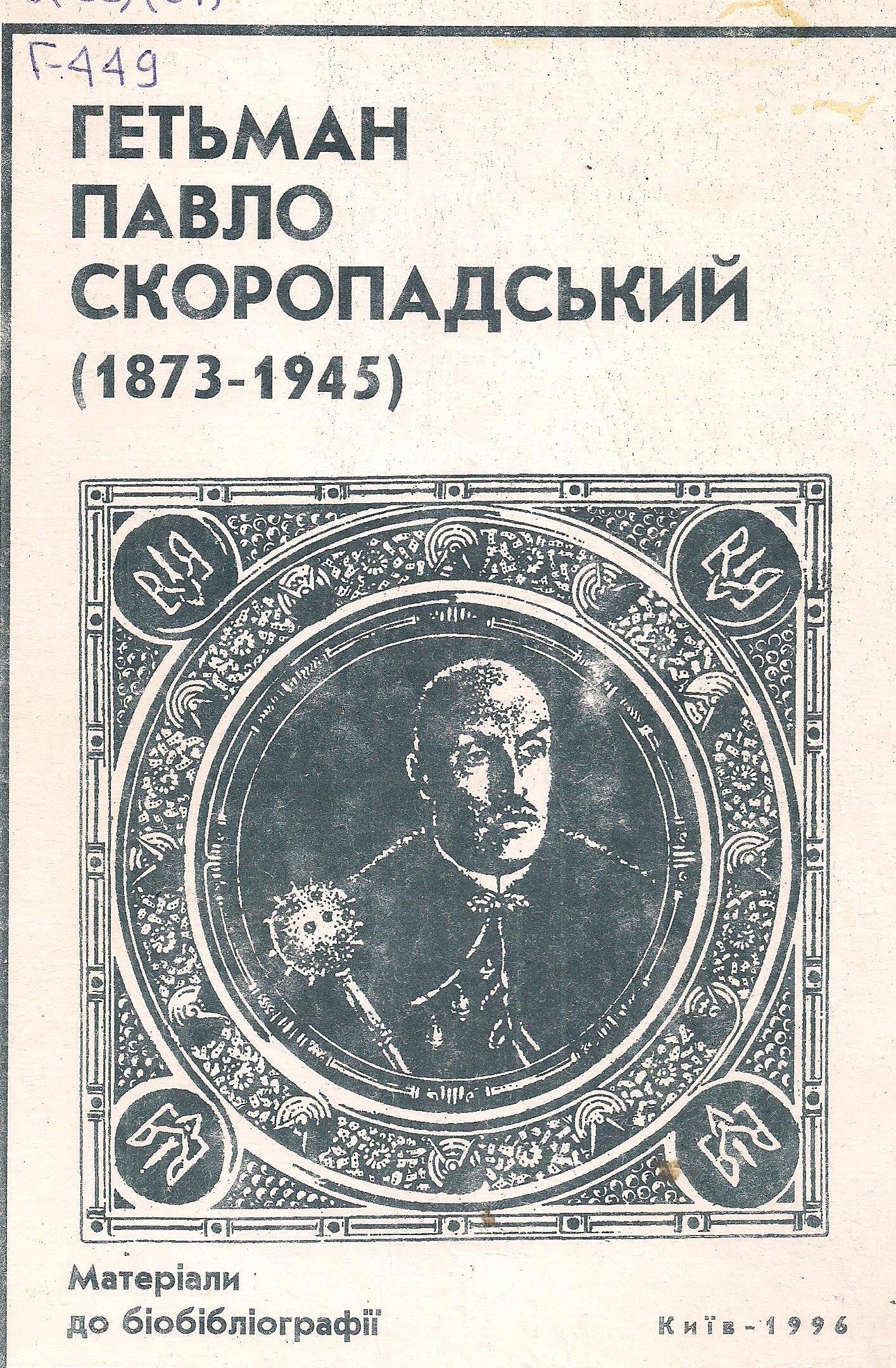 Гетьман Павло Скоропадський (1873–1945) : матеріали до бібліографії / НАН України, Центр. Наук. Б-ка ім. В. І. Вернадського, Музей гетьманства Голов. Упр. Культури м. Києва ; сост.: Г. Шовкопляс, І. Шовкопляс. – Київ : Бібліотечний вісник, 1996. – 52 с.
