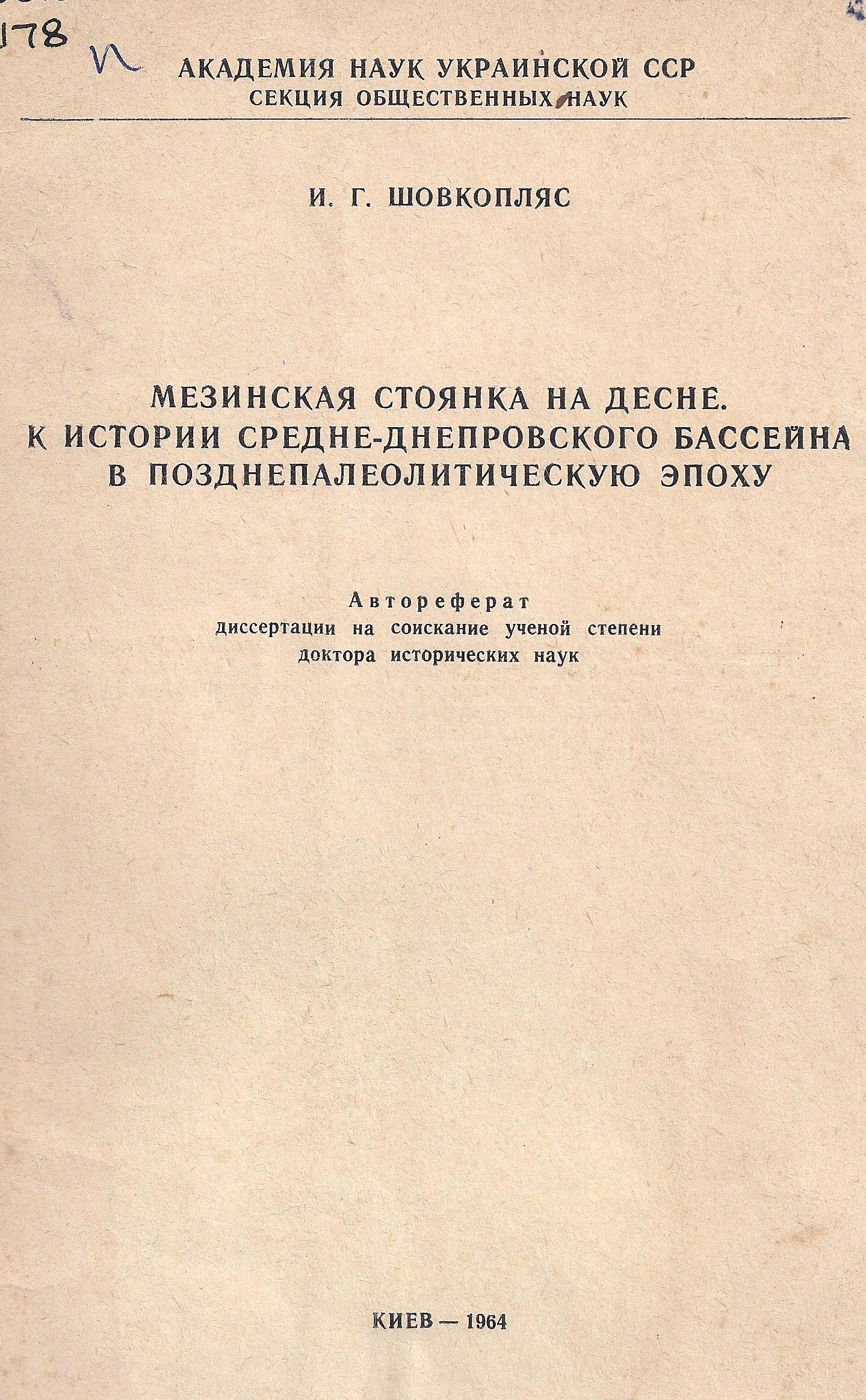 Шовкопляс И. Г. Мезинская стоянка : к истории Среднеднепровского бассейна в позднепалеолитическую эпоху: автореферат дис. ... д-ра ист. наук / И. Г. Шовкопляс ; АН УССР. Ин-т обществ. наук. – Киев, 1964. – 37 с.