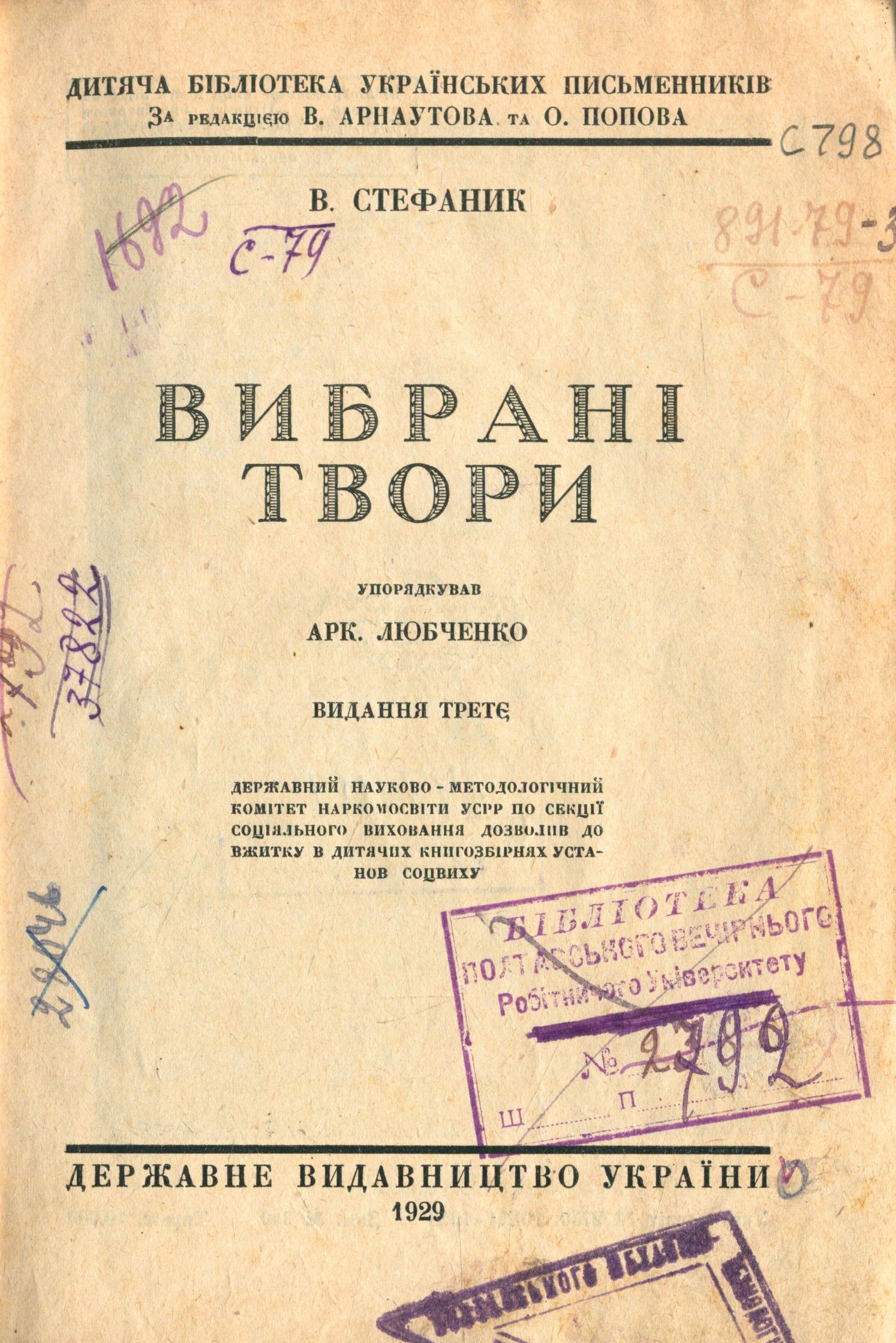 3. Стефаник В. С. Вибрані твори / В. Стефаник ; упоряд. Арк. Любченко. – 3-тє вид. – [Харків] : Держ. вид-во України, 1929. – 127 с. : портр., іл. – (Дитяча б-ка укр. письменників / за ред. В. Арнаутова та О. Попова).