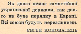 Життя і діяльність Євгена Коновальця символізує цілу епоху боротьби України за власну незалежну соборну державу. Поразка національно-визвольних змагань 1917-1921 рр. та чотиристороння окупація України спонукали Євгена Коновальця до пошуку нових методів боротьби за незалежність України проти окупаційних режимів.