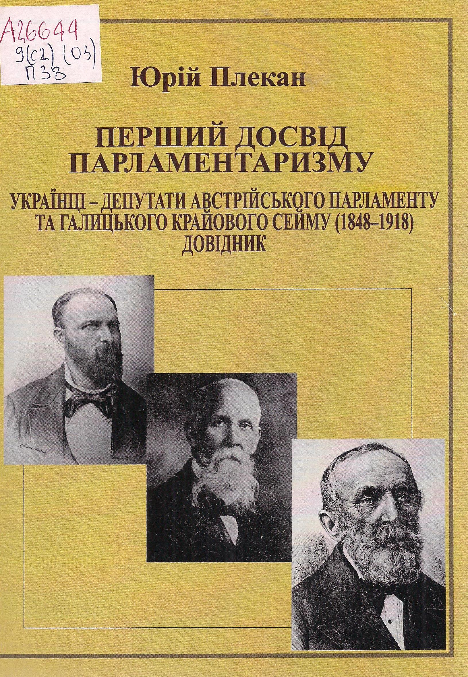 Плекан Ю. Перший досвід парламентаризму: українці – депутати австрійського парламенту та галицького крайового сейму (1848-1918) : довідник / Ю. Плекан. – Івано-Франківськ, 2012. – 140 с.