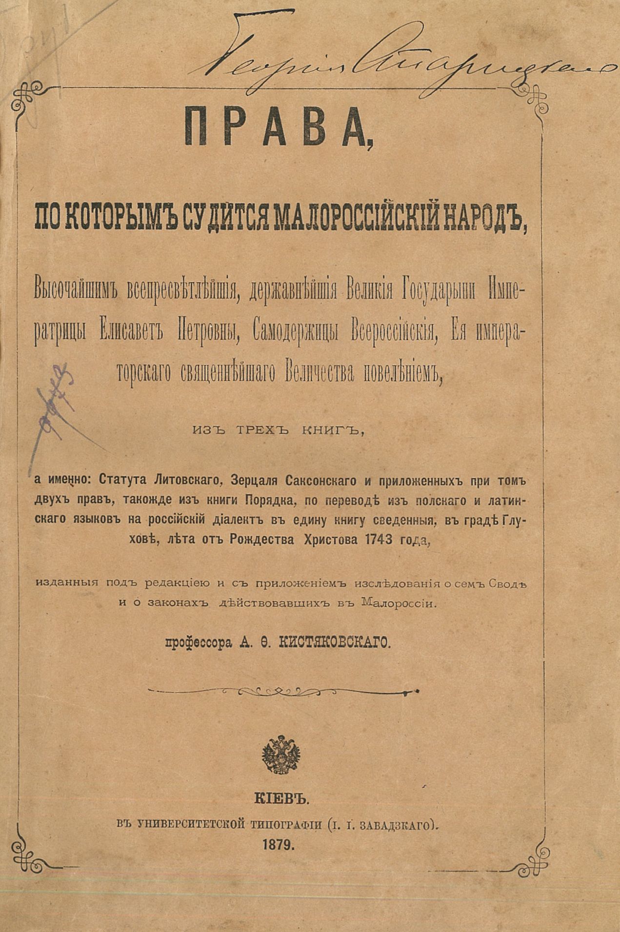 Документ видано у Києві у 1879 р. в Університецький типографії (І. І. Завадсього). До друку підготовлено професором А. Ф. Кістяківським.