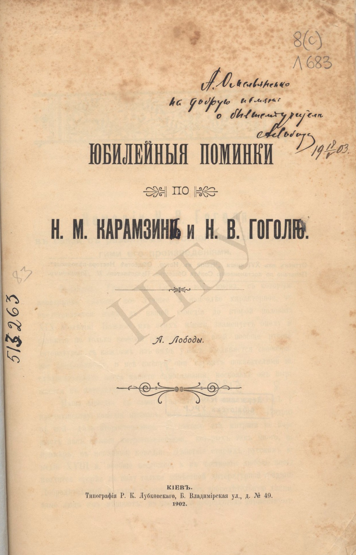 Лобода, Андрей Митрофанович. Юбилейные поминки по Н. М. Карамзину и Н. В. Гоголю / А. Лобода. – Киев : Тип. Р.К. Лубковского, 1902. – 29 с. – Автограф: «А. Омельяненко на добрую память о бывшем учителе. А. Лобода. 18.V.1903».