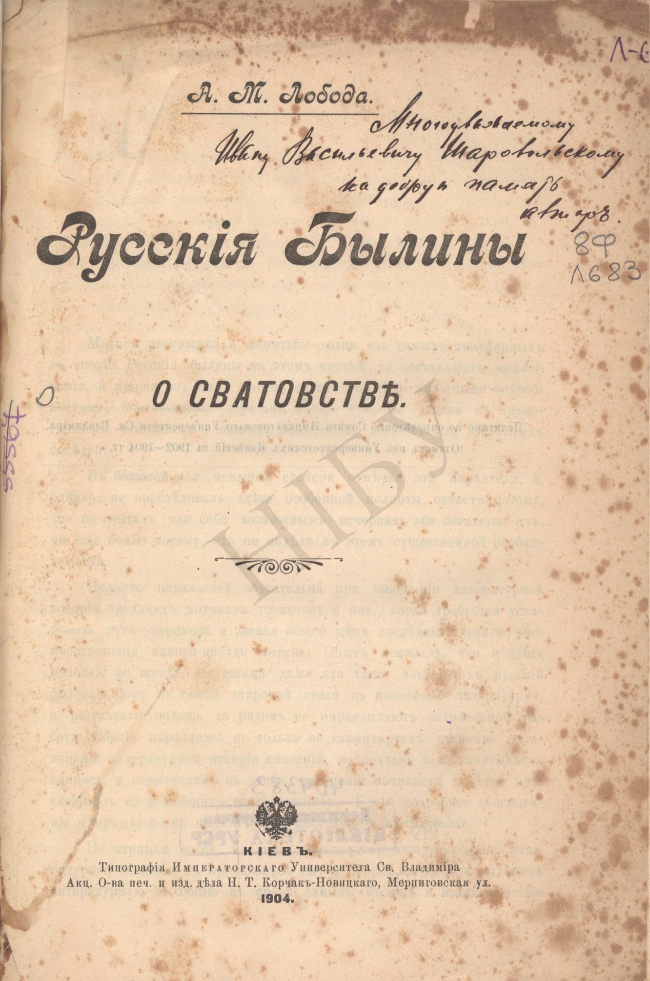 Лобода, Андрей Митрофанович. Русские былины о сватовстве / А. М. Лобода. - Киев : Тип.