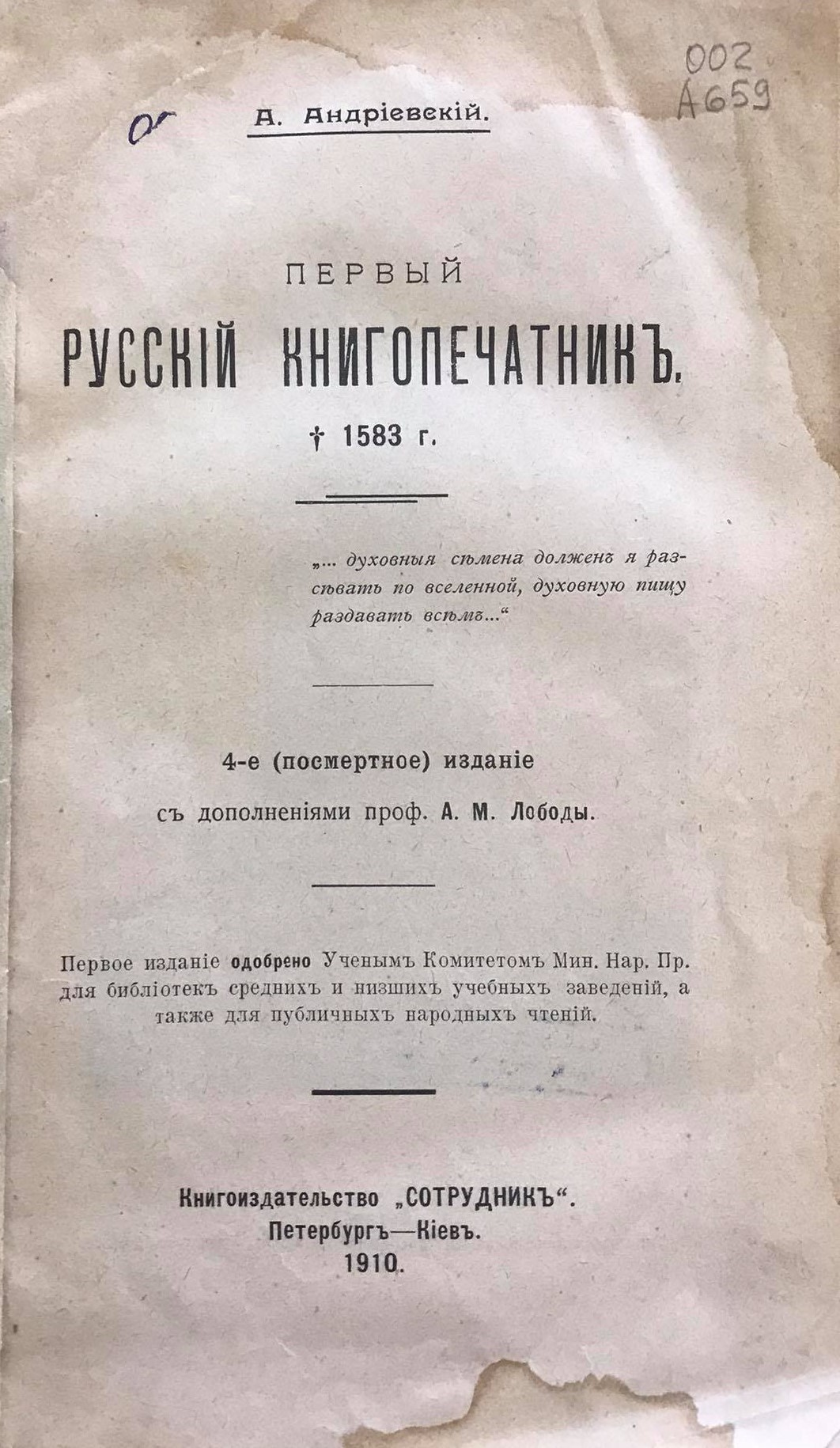 Андриевский А. Первый русский книгопечатник. - 4-е изд. с дополнениями проф. А. М. Лободы / А. Андриевский. – Петербург : Киев: Сотрудник, 1910. - 30 с.