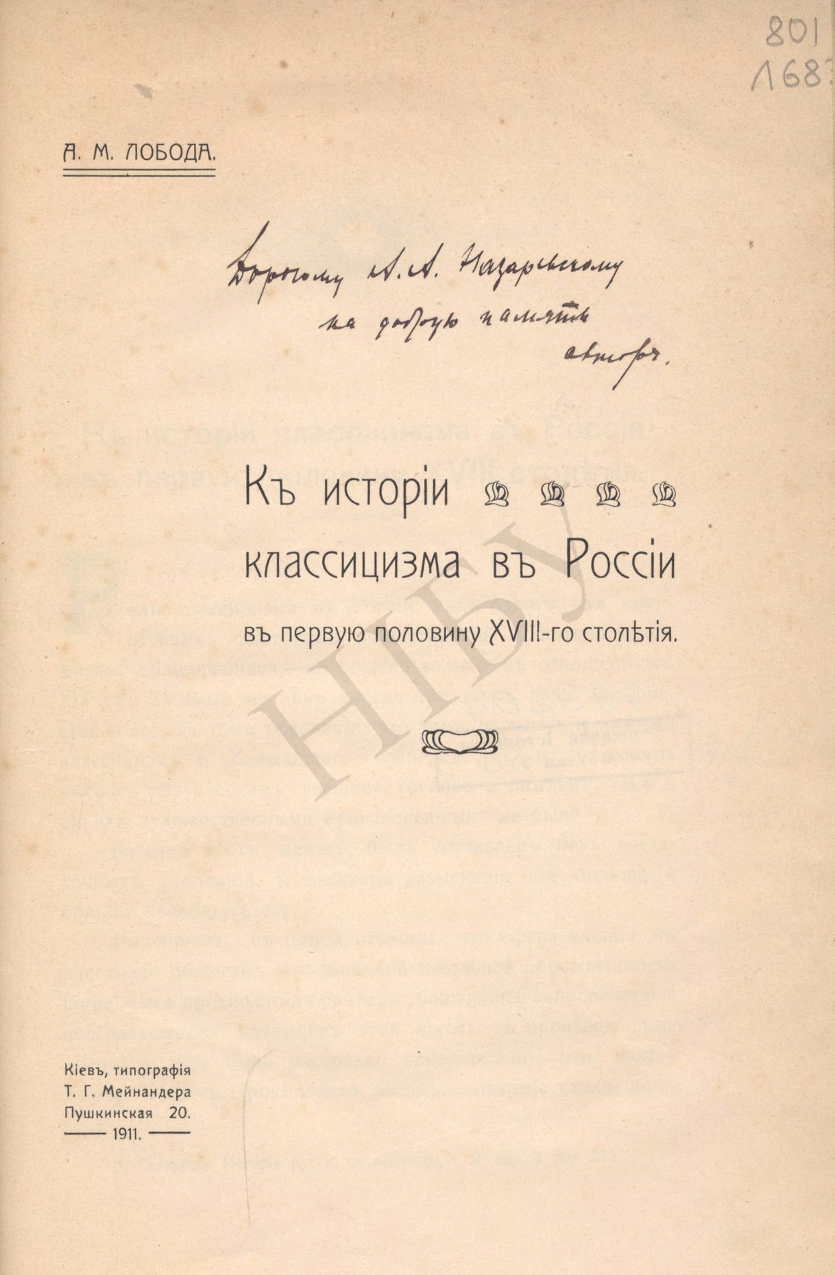 Лобода, Андрей Митрофанович. К истории классицизма в России в первую половину ХVІІІ-го столетия / А. М. Лобода. - Киев