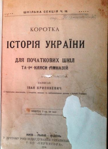 Крип’якевич, Іван Петрович. Коротка історія України : для початкових шкіл та 1-го класу гімназій : (з багатьма малюнками, 2 історичн. мапами та найважнішими датами з історії України) / І. П. Крип’якевич. - Київ ; Львів : Вернигора, 1918. - 88 с.