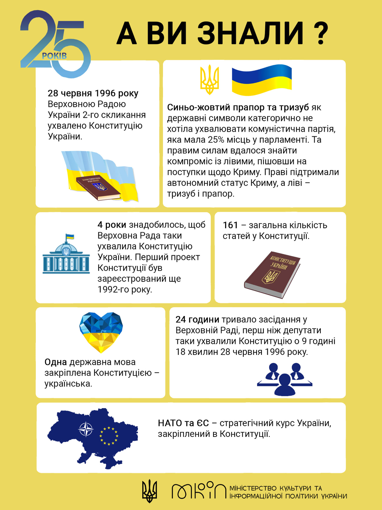 Книжкова виставка з фонду НІБУ до 25-річчя Конституції України. Низка книжкових видань висвітлює історію української Конституції та конституційного процесу в Україні з найдавніших часів до сьогодення.