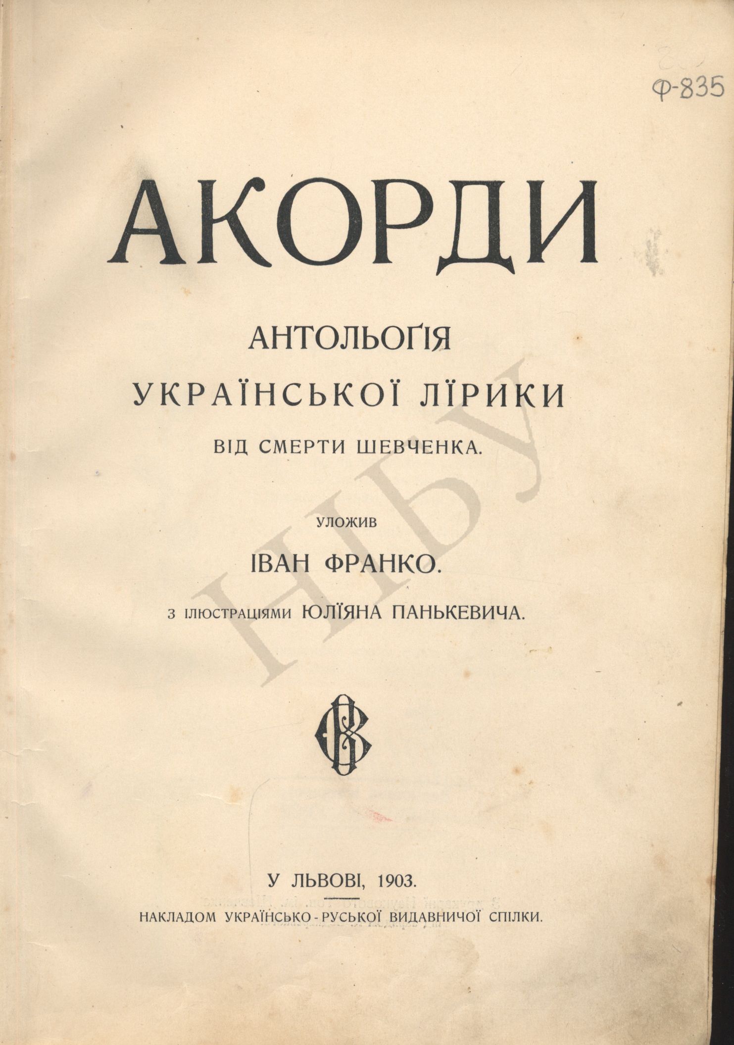 5. Акорди : антологія української лірики від смерті Шевченка / уложив Іван Франко; з ілюстраціями Юлїяна Панькевича. – Львів : Накладом Укр.-руської Видавн. Спілки. [Друк. Наук. Тов. ім. Шевченка. Під зарядом К. Бернарського], 1903. – 316 с. : іл.