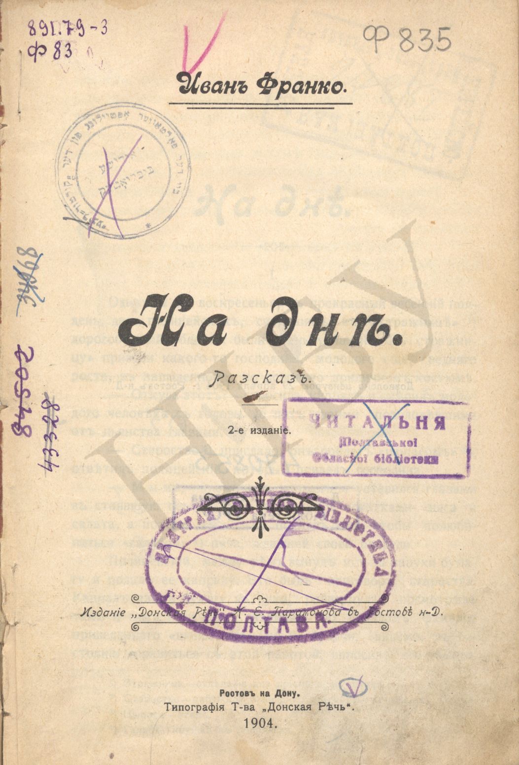 6. Франко И. На дне : рассказ / И. Франко. – 2-е изд. – Ростов на Дону : Донская речь, 1904. – 199 с.