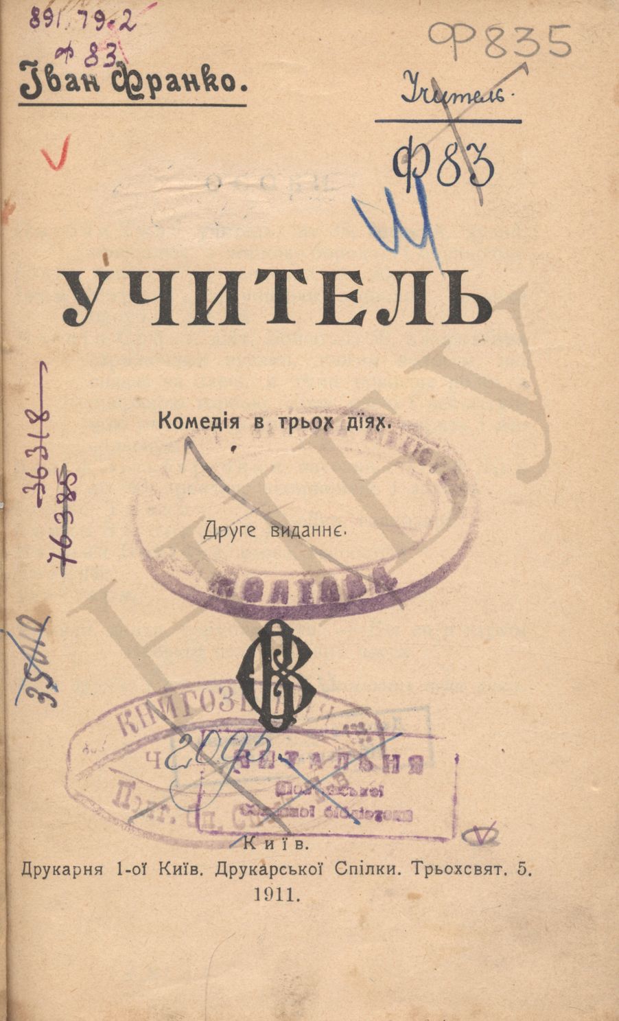 12. Франко І. Я. Учитель: комедія в трьох діях / Іван Франко. – 2-е вид. – Київ: Друк. 1-ої Київ. Друк. Спілки, 1911. – 76 с. - (Літ. Наук. Б-ка Укр.- Руської Видавн. Спілки. Сер.1; Ч.119).