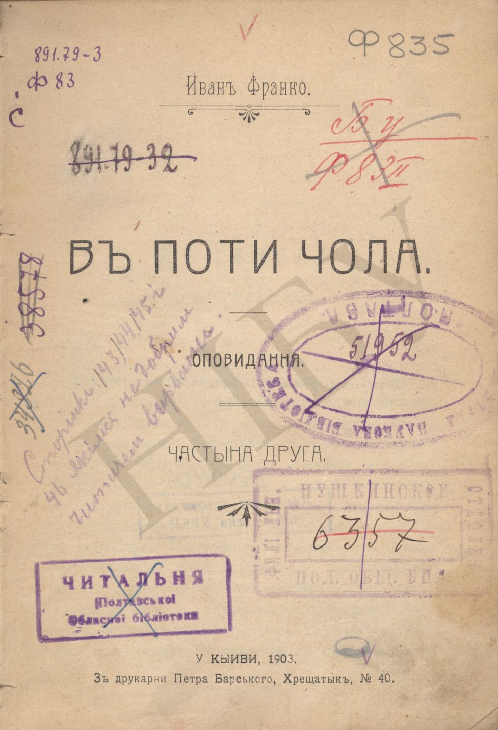 4. Франко І. Я. Збірник творів Івана Франка / Т. 2. В поти чола : оповидання /І. Я. Франко. – Київ : Друк. П. Барського, 1903. – 241 с.
