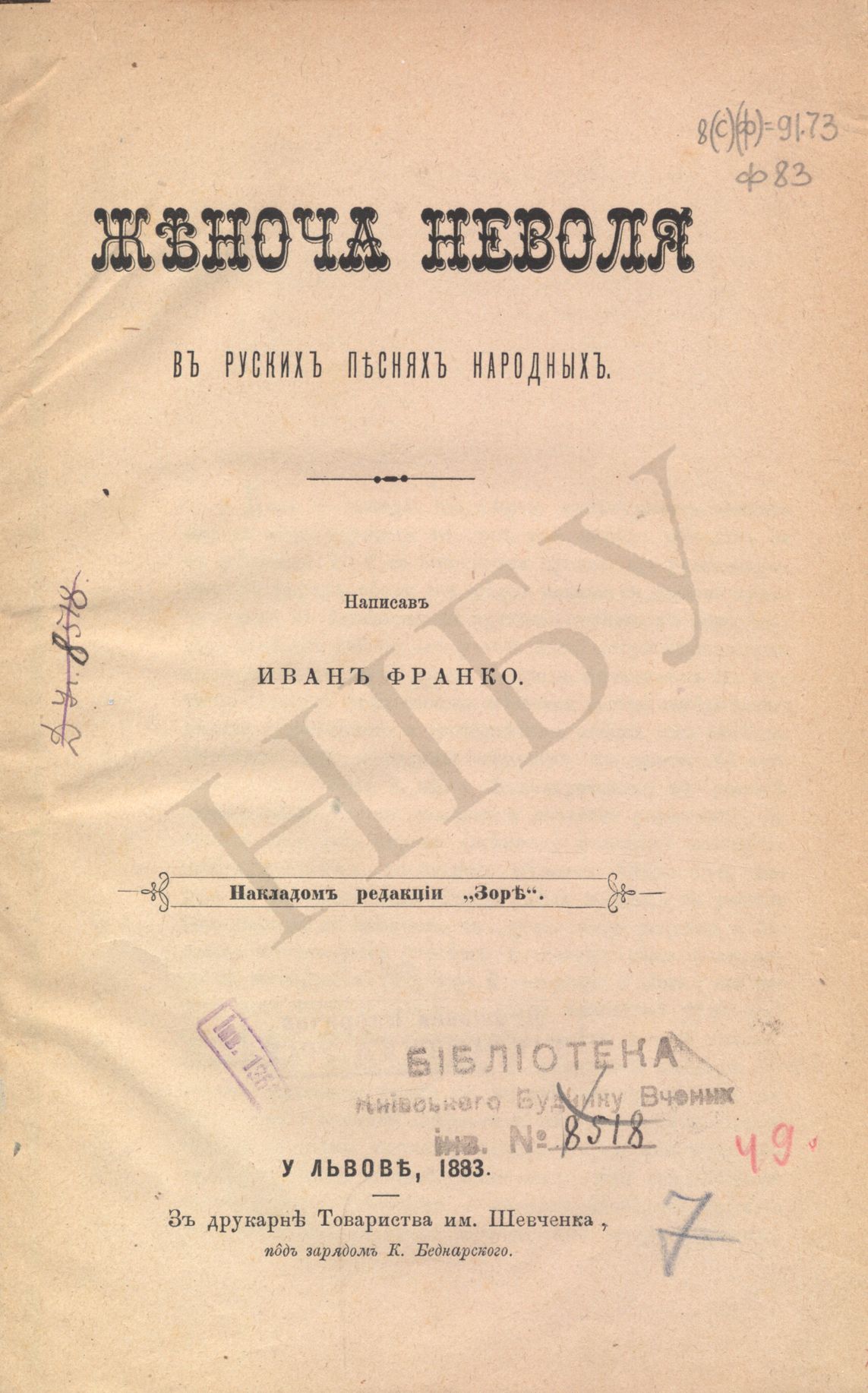 1. Франко І. Я. Жіноча неволя в руских піснях народных / написав Іван Франко. - Львів : Накладом ред. «Зоря»; Друк. т-ва им. Шевченка. Під зарядом К. Беднарского, 1883. - 50 с.