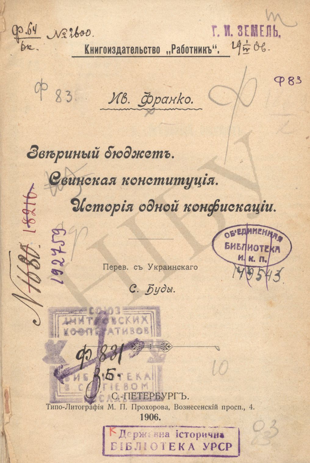 8. Франко И. Звериный бюджет. Свинская конституция. История одной конфискации / И. Франко; пер. С. Буды. - Санкт-Петербург : Типо-лит. М. П. Прохорова, 1906. – 171 с.