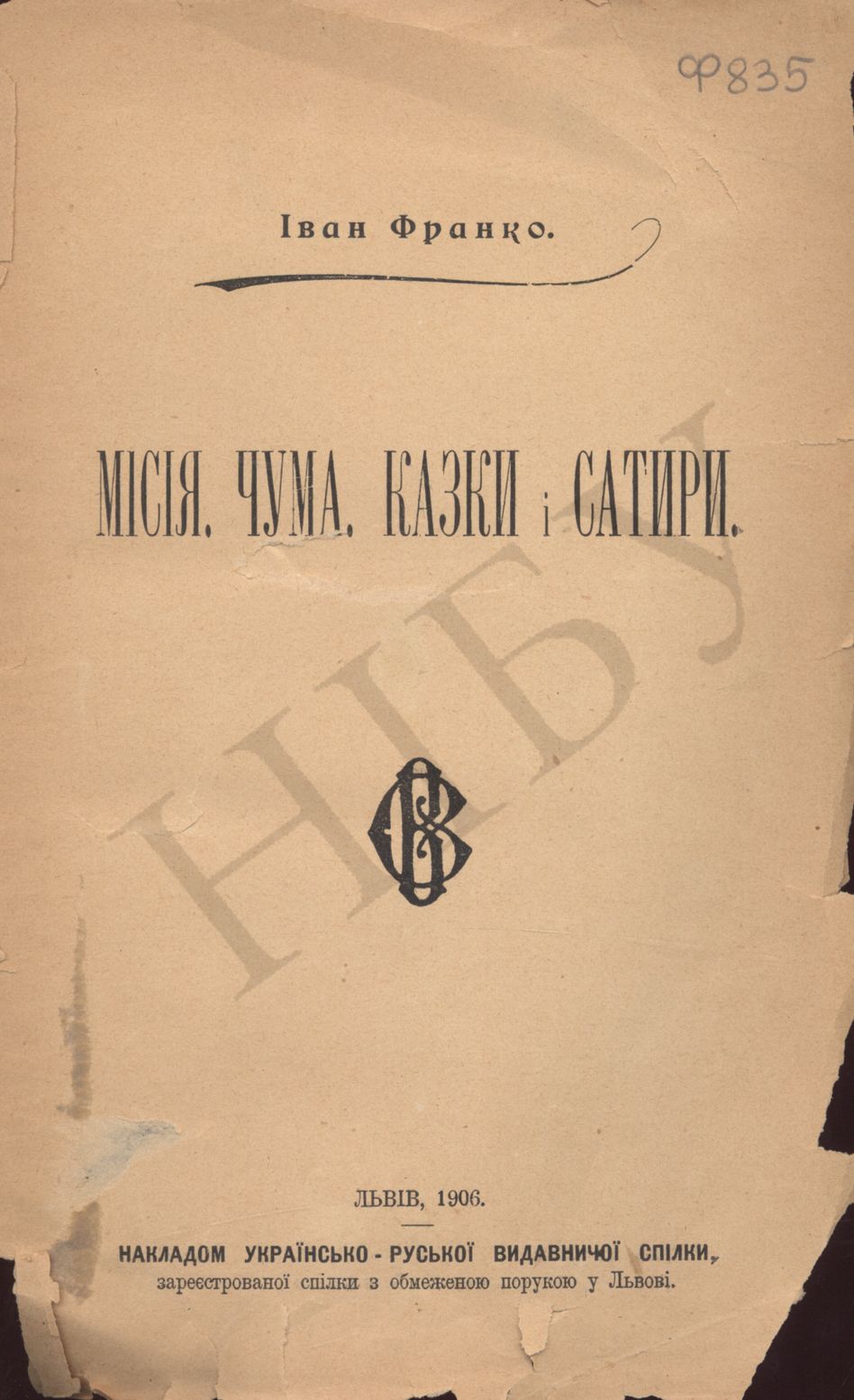 9. Франко І. Я. Місія. Чума. Казки і сатири / І. Франко. – Львів : Накладом Укр. – Рускої Видавн. Спілки; Друк. Наук. Тов-ва ім. Шевченка. Під зарядом К. Беднарського, 1906. – 210, [2] с. – (Літ. Наук. Б-ка Укр. Укр.-Руської Видавн. Спілки. Сер.1; Ч.101).