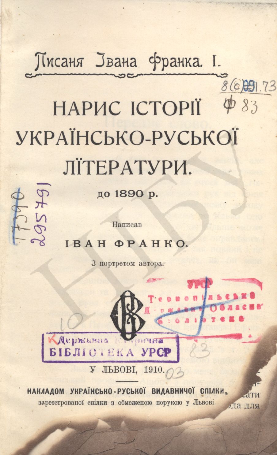 11. Франко І. Я. Нарис історії українсько-руської літератури до 1890 року / написав Іван Франко. – Львів : Накладом Укр.-Руської Видавн. Спілки. Друк. Наук. Тов. ім. Шевченка. Під зарядом К. Беднарського, 1910. – 426 с.