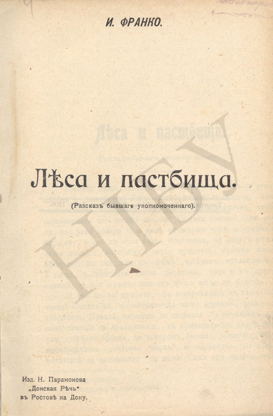 10. Франко И. Леса и пастбища / И. Франко. – Ростов на Дону : Донская речь, 1906. – 16 с.