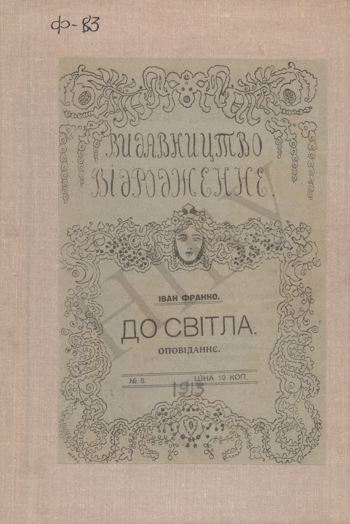13. Франко І. [Я.] До світла: оповіданнє / І. Франко . – [Київ: Накладом Вид-ва «Відродженнє»; Друк. 5 Київ. Спілки, 1913]. – 24 с. : портр.