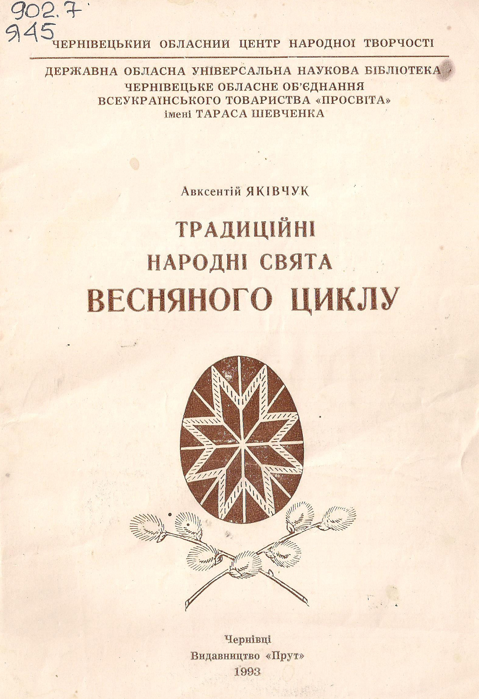 Яківчук А. Традиційні народні свята весняного циклу / А. Яківчук ; Чернівецький обласний центр народної творчості, Державна обласна універсальна наукова бібліотека (Чернівці), Всеукраїнське товариство “Просвіта” імені Тараса Шевченка, Чернівецьке обласне об’єднання. – Чернівці : Прут, 1993. – 28 с.