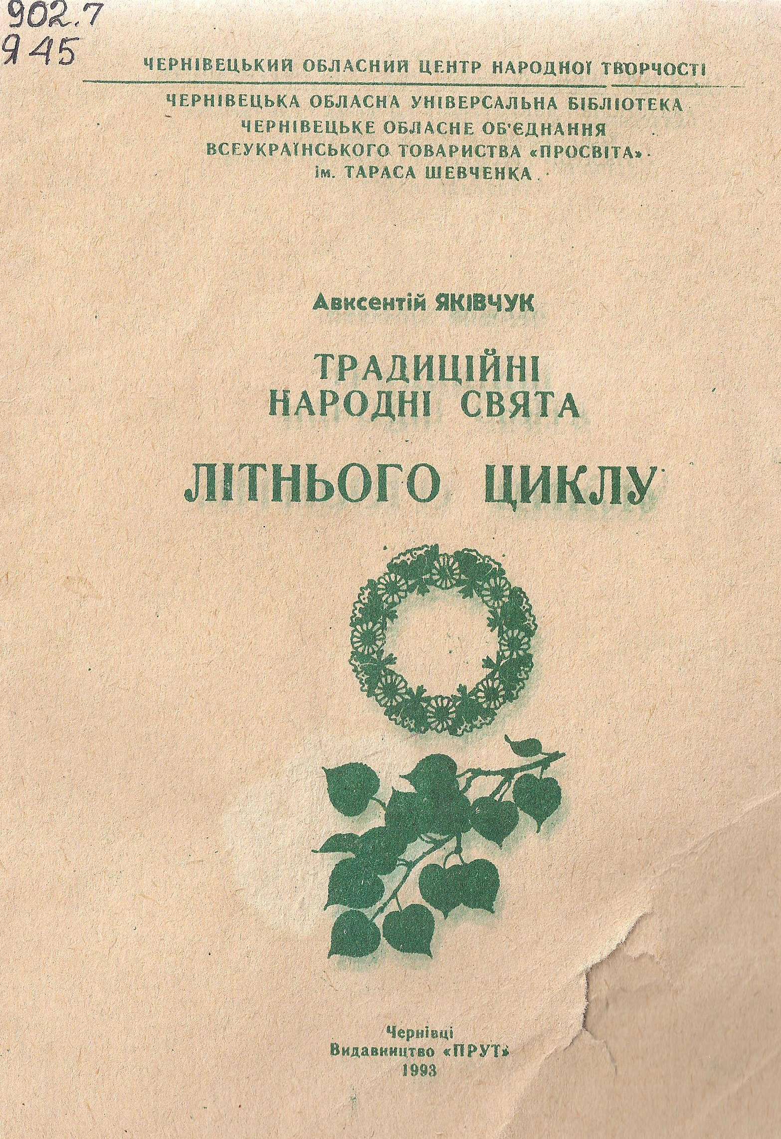 Яківчук А. Традиційні народні свята літнього циклу / А. Яківчук ; Чернівецька обласна універсальна бібліотека, Чернівецький обласний центр народної творчості, Всеукраїнське товариство “Просвіта” ім. Тараса Шевченка, Чернівецьке крайове об’єднання. – Чернівці : Прут, 1993. – 21 с.