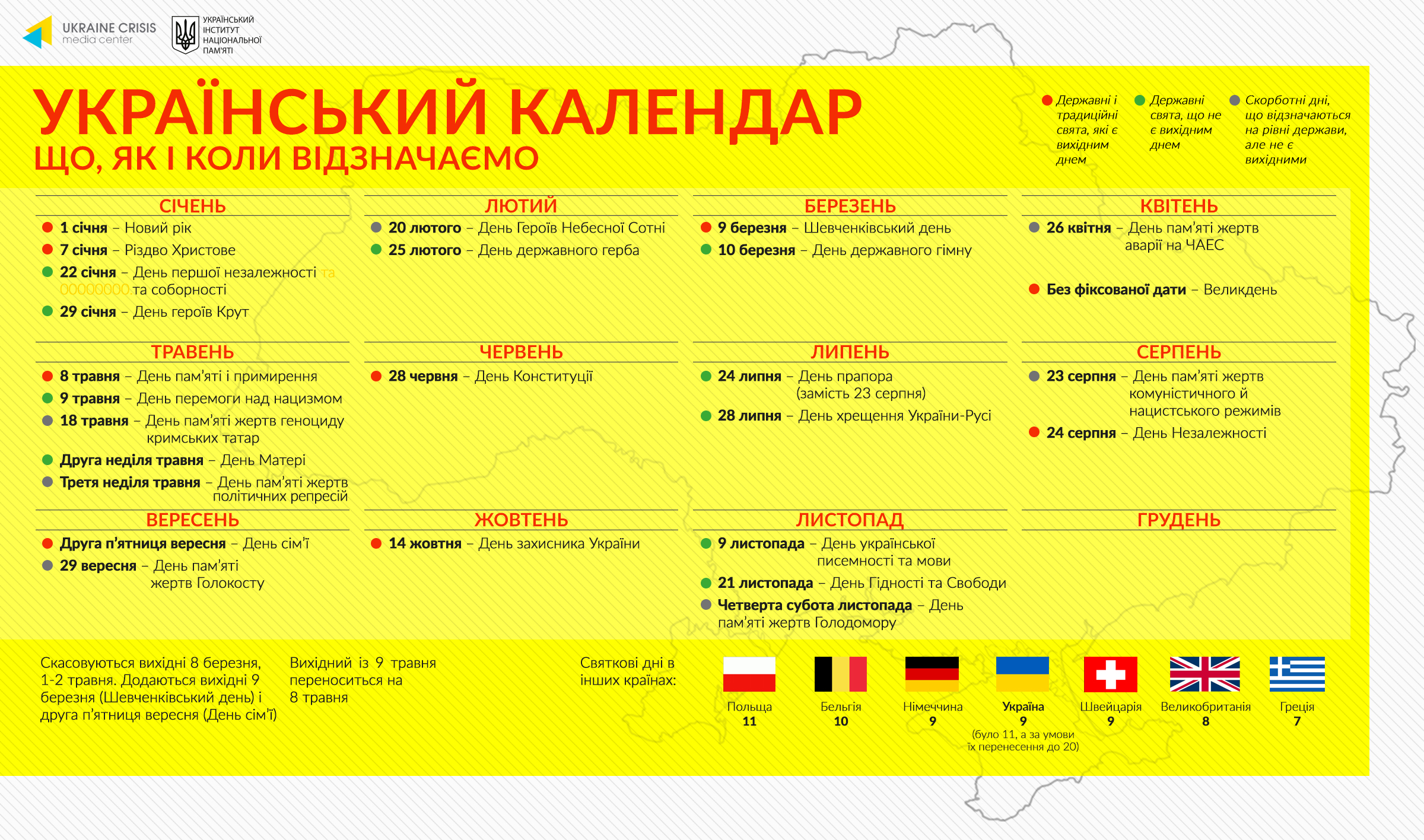 Один із системних варіантів реформи державного святкового календаря запропонував у 2017 році Український інститут національної пам’яті. Автори законопроекту “Про державні та інші свята, пам’ятні дати і скорботні дні” систематизували категорії свят та поділили їх на державні (з робочими та неробочими днями), міжнародні свята, дні жалоби, пам’ятні дати, професійні свята, скорботні дні, традиційні свята.
