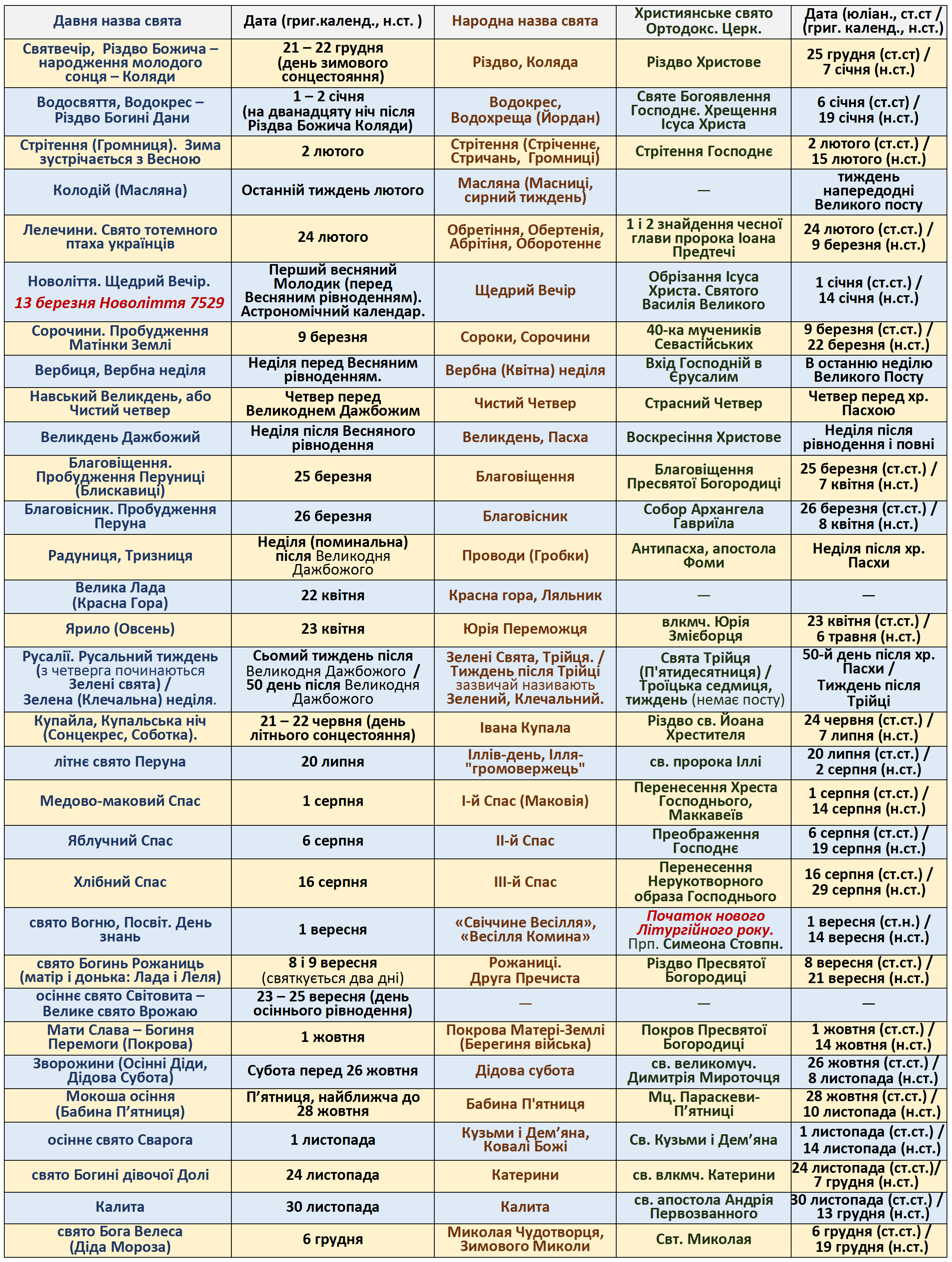 Наші Предки, як відомо з літописів, починали рік навесні, оскільки були аграрним народом. Праукраїнський календар відповідав фазам небесних світил: Місяця і Сонця. Місяць допомагав нашим Предками здійснювати відлік часу в днях, а Сонце – в роках. Оскільки зміни пір року залежали від інтенсивності обігрівання Землі сонячним промінням, то початок нового року у наших Предків був логічною прив’язкою до такої фази Сонця, як Весняне рівнодення. Отже, точною датою початку Нового року у наших Пращурів є останній Молодик перед Весняним рівноденням. Одночасно з цим Молодиком наставало нове літо, отже, свято Нового року називається Новоліттям. Від точності визначення дня Новоліття залежить цілий ряд інших свят «Кола Сварожого» (Вербиці, Великодня, Правої Середи, Русалій та ін.). Отже, календар потребує постійного щорічного корегування – не можна брати язичницький календар будь-якого року і застосовувати його у році наступному [6]. Об’єднання рідновірів України 1993 року відновило в Україні язичницький обрядовий календар «Коло Свароже», який виявилося можливим реконструювати за наявними сьогодні науковими (астрономічними, етнографічними, фольклорними) джерелами. Цього року (2021 р.) весняний Молодик (або новий Місяць) був 13 березня, отже за календарем «Коло Свароже» 13 березня – початок літа 7529.
