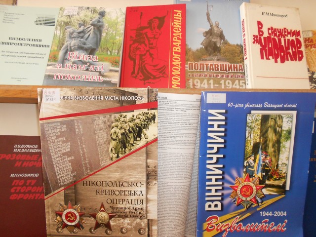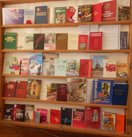 Експозицію книжково-журнальної виставки «Друга світова війна в історичній пам’яті України» розміщено в залі каталогів на другому поверсі Бібліотеки з 7 травня 2014 року.