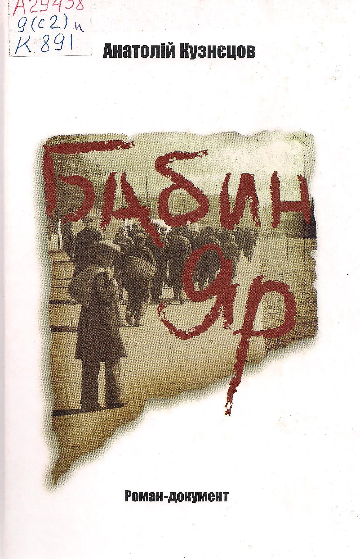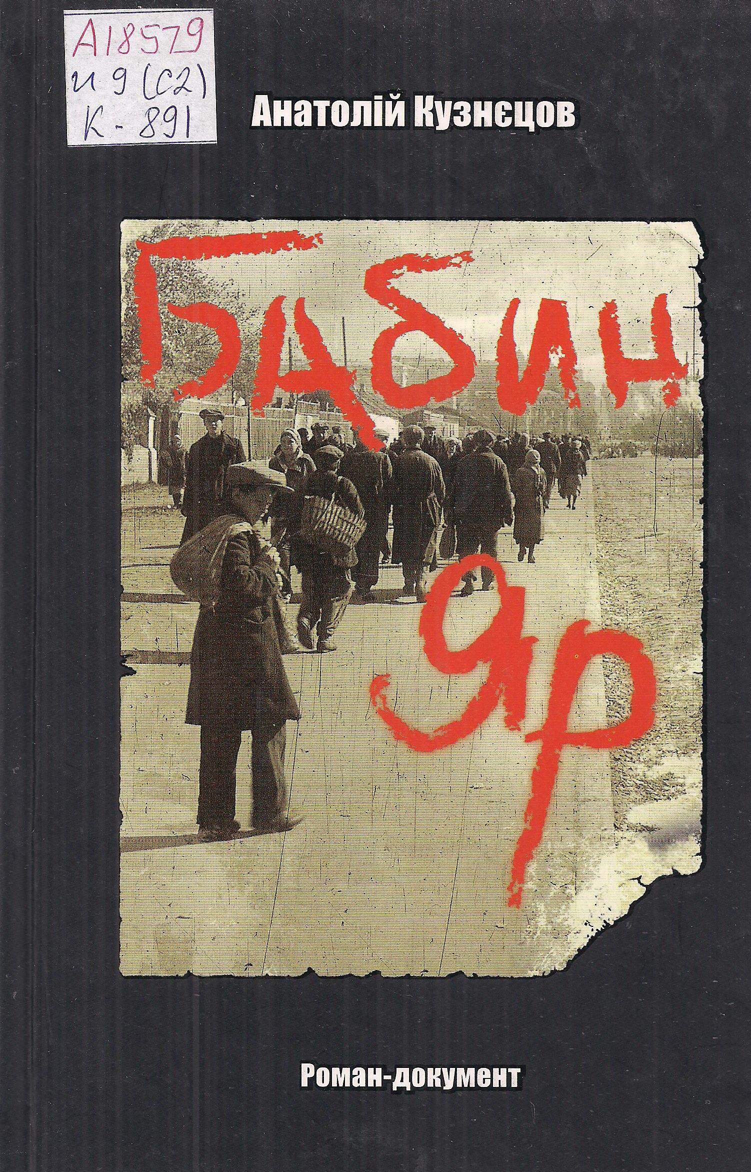 - Кузнєцов А. Бабин Яр : [роман-документ про події 1941–1943 рр. у Києві] / А. Кузнєцов. – Київ : Саміт-книга, 2009. – 351 с. : іл.
