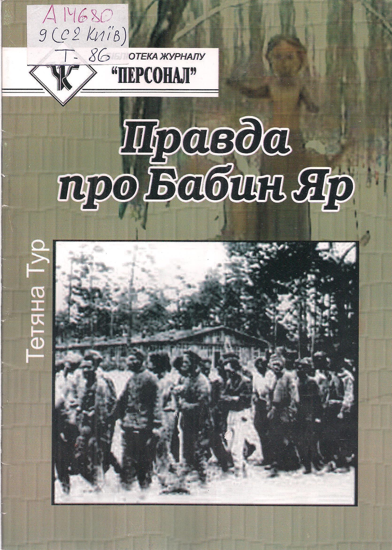 - Тур Т. Правда про Бабин Яр : документальне дослідження / Т. Тур ; Межрегіональна Академія Управлінния Персоналом. – Київ : МАУП, 2006. – 23 с.