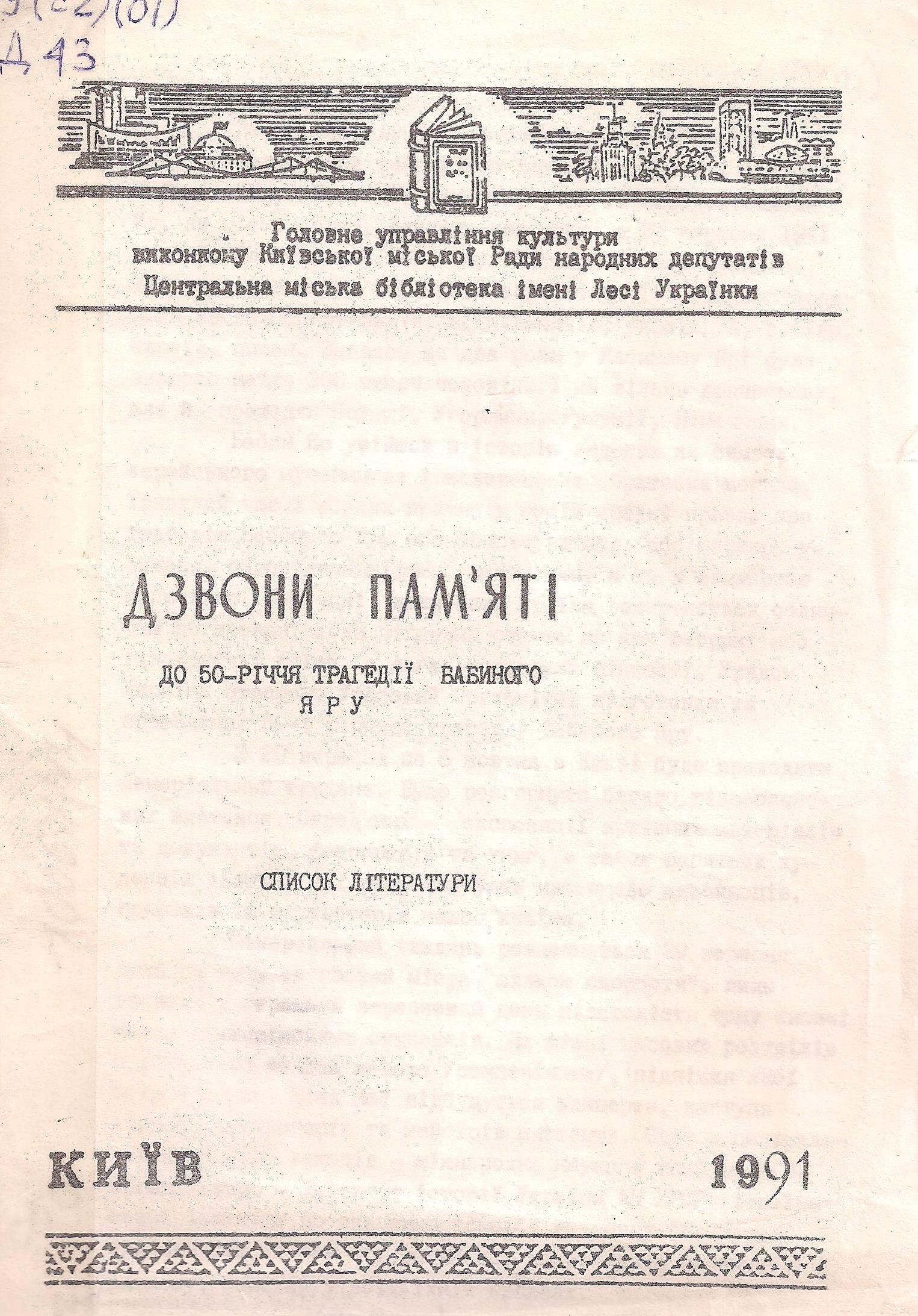 - Дзвони пам’яті : до 50-річчя трагедії Бабиного Яру : список літератури / Київська міськрада народних депутатів. Головне упр. культури і мистецтв, Центральна міська бібліотека ім. Лесі Українки ; склад. А. П. Роздобудько. – Київ, 1991. – 7 с.