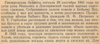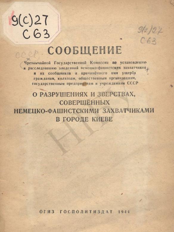 асследованию злодеяний немецко-фашистских захватчиков и их сообщников и причиненного ими ущерба гражданам, колхозам, общественным организациям, государственным предприятиям и учреждениям СССР [Електронний документ] : о разрушениях и зверствах, совершенных немецко-фашистскими захватчиками в городе Киеве. – Москва : ОГИЗ, 1944. – С. 10-15