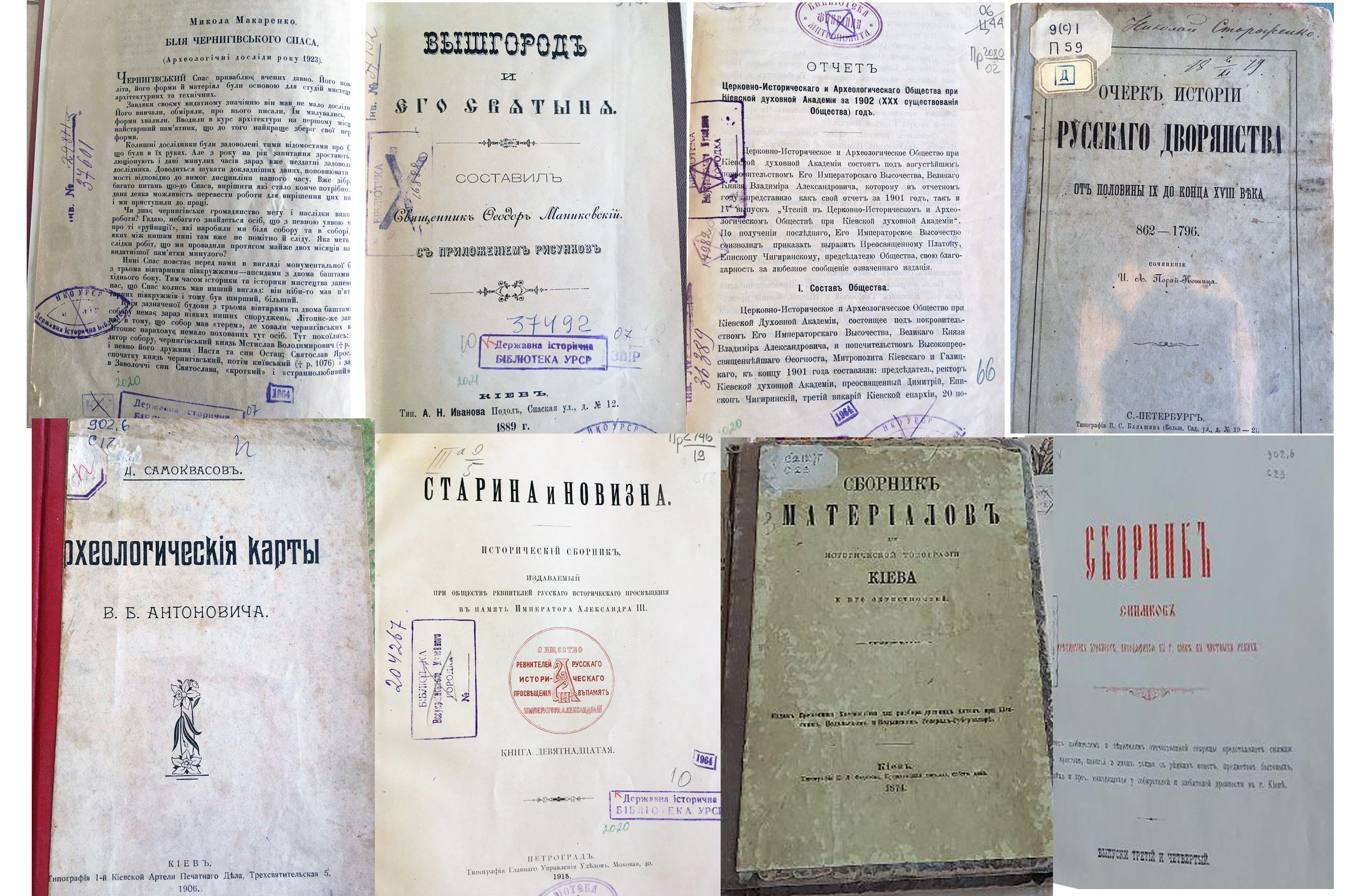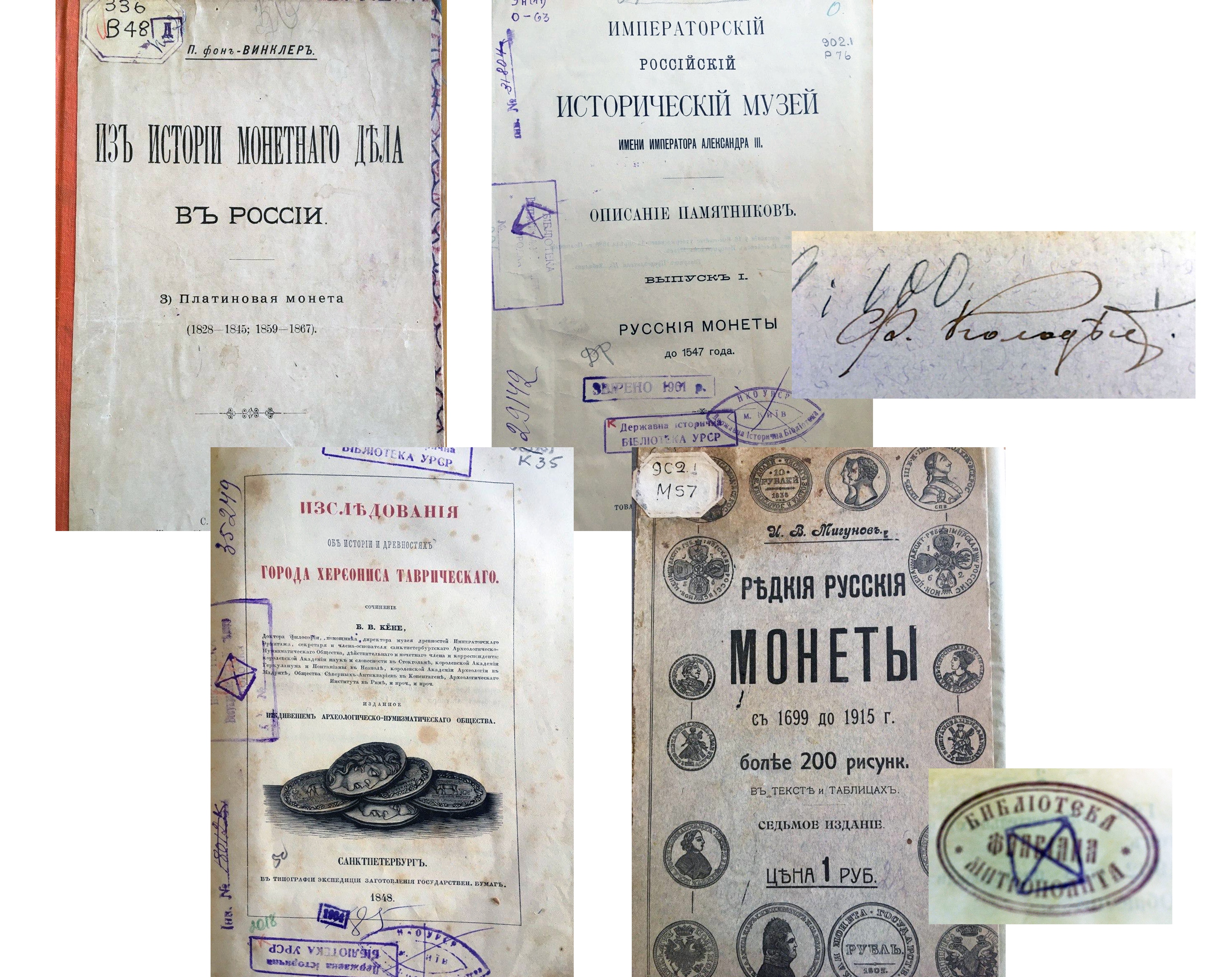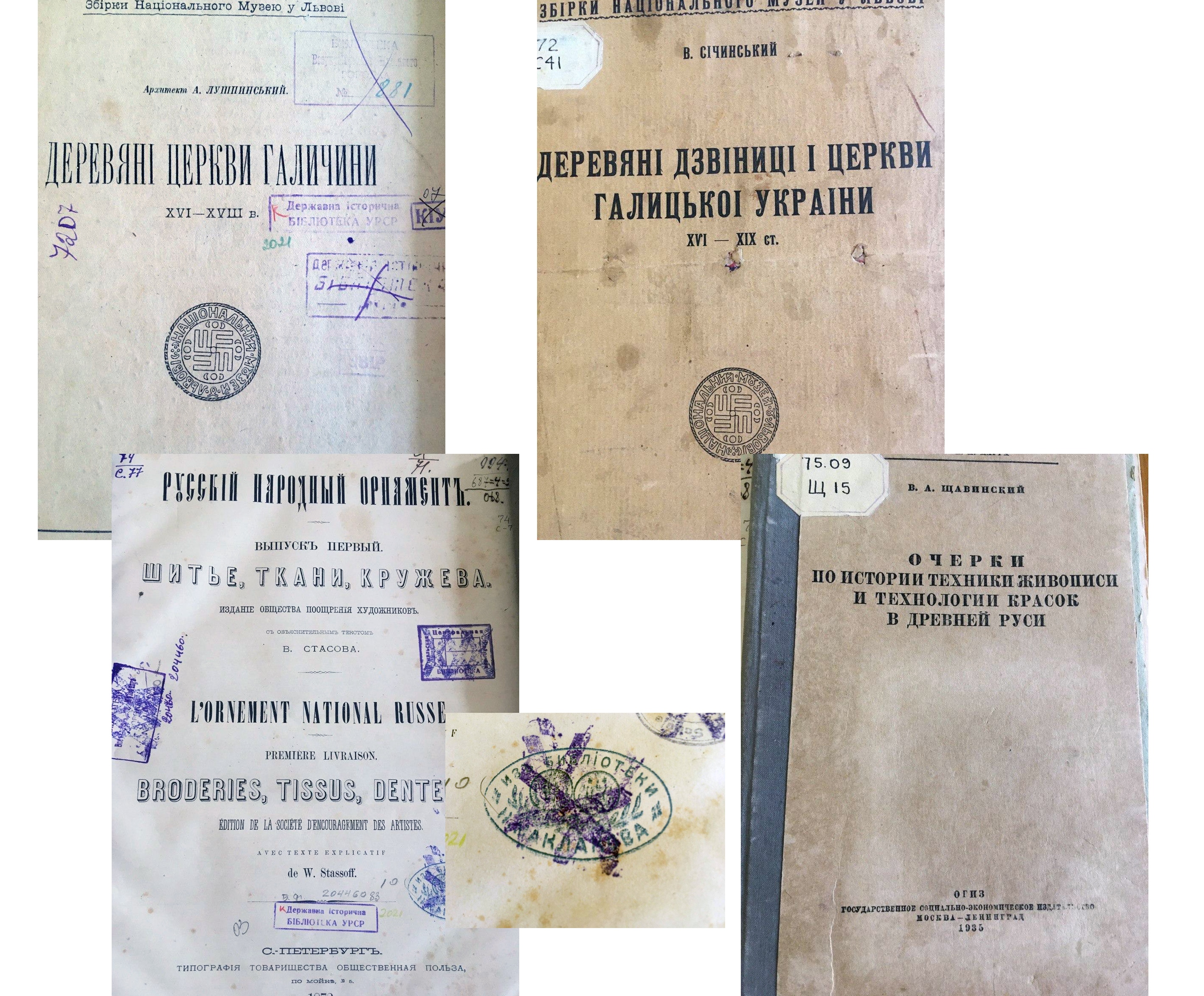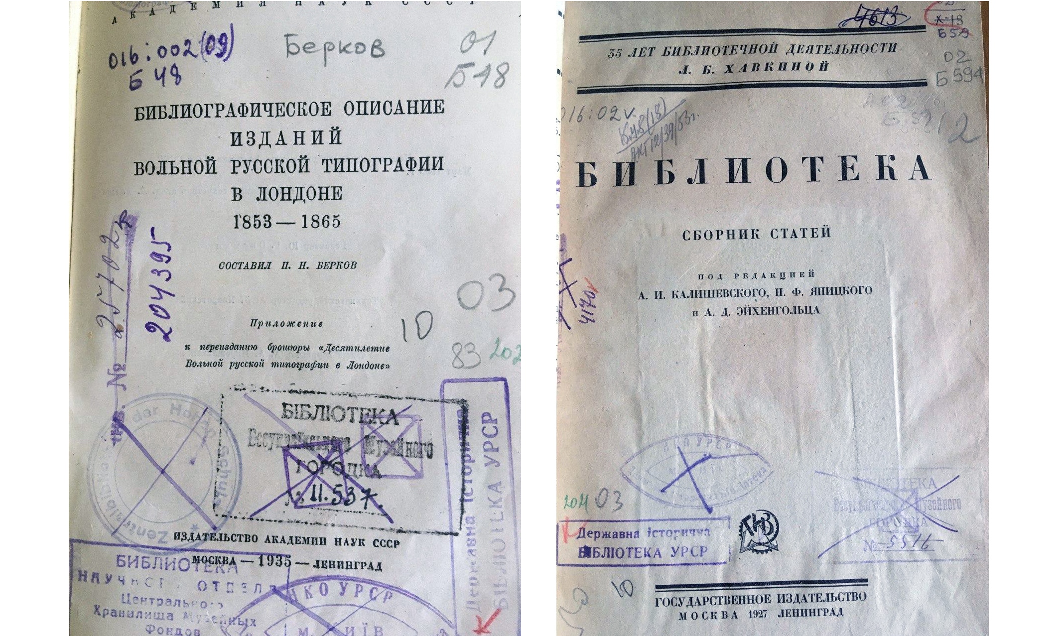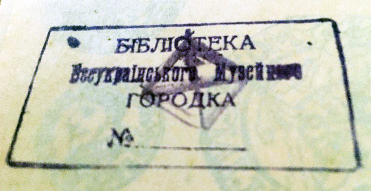 Окрім штампу «Бібліотека Всеукраїнського Музейного Городка», на титульному аркуші бібліографічної праці літературознавця, бібліографа, книгознавця, історика літератури Павла Наумовича Бєркова (1896-1969), можна розгледіти штампи «Zentralbibliothek der Hohen Schule» та «Библиотека Научного отдела Центрального Хранилища Музейных Фондов. Екатерининский дворец. Инв. №3 [рукоп.].