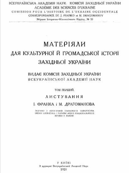 - Матеріяли для культурної й громадської історії Західньої України [Електронний документ]. Том 1. Листування І. Франка і М. Драгоманова : зібрано з автографів Наукового Товариства імені Шевченка і Українського Національного Музею у Львові. – Київ : З друкарні Всеукраїнської Академії наук, 1928. – IV, 508 с. https://nibu.kyiv.ua/elfond/materijaly_dlia_kulturnoji_istoriji_t_1/materijaly_dlia_kulturnoji_istoriji_t_1.pdf