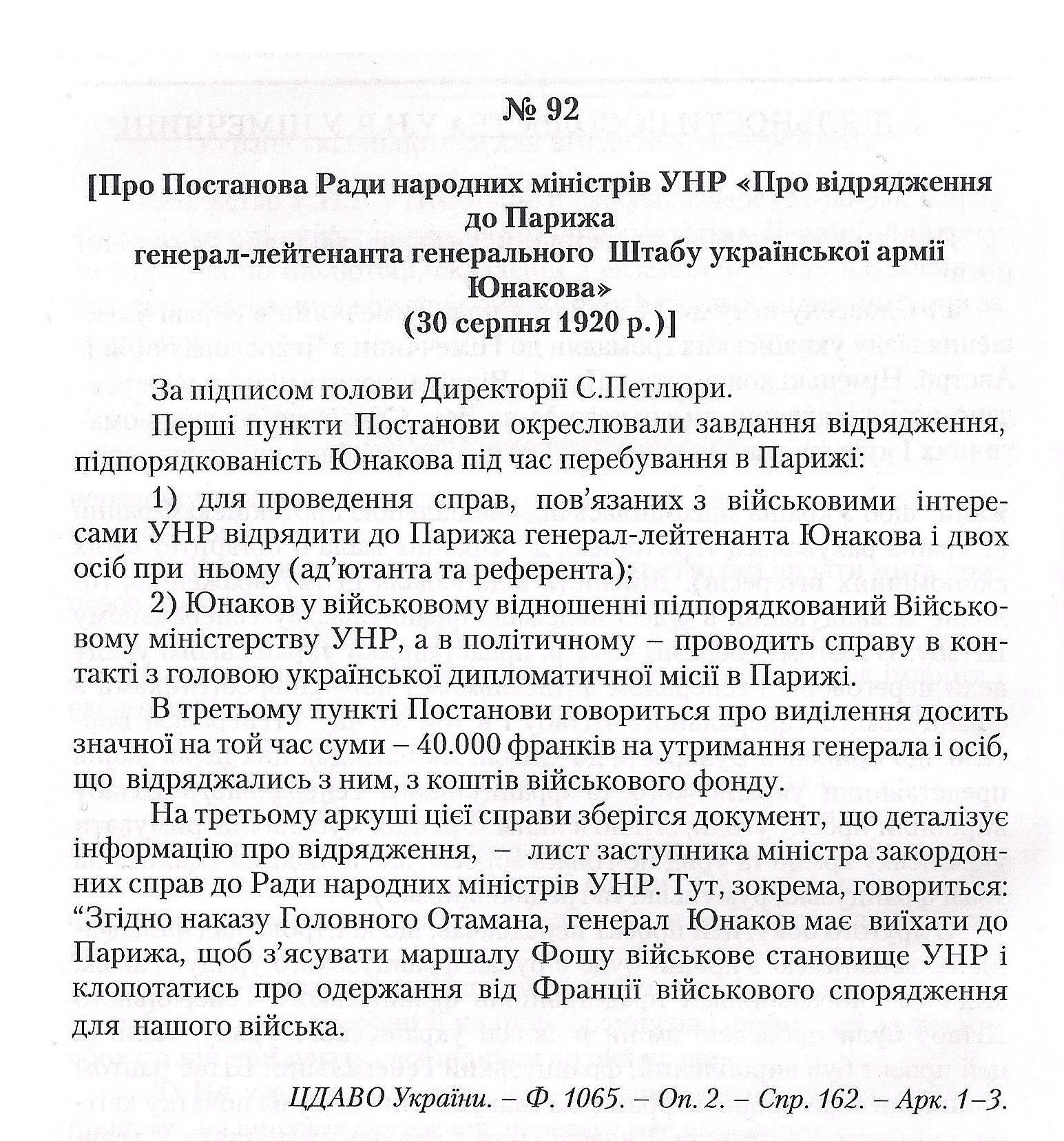 - Гай-Нижник П. Українська дипломатія й міжнародна фінансова політика урядів Центральної Ради, Української Держави (Гетьманату) та Директорії УНР (1917–1922 рр.) : [Постанова Ради народних міністрів УНР "Про відрядження до Парижа генерал-лейтенанта генерального Штабу української армії Юнакова" (30 серпня 1920 р.)] / П. Гай-Нижник ; М-во освіти і науки України, Науково-дослідний інститут українознавства, М-во закордонних справ України, Дипломатична академія України. - Київ : Дуліби, 2016. – С. 473 – 474.