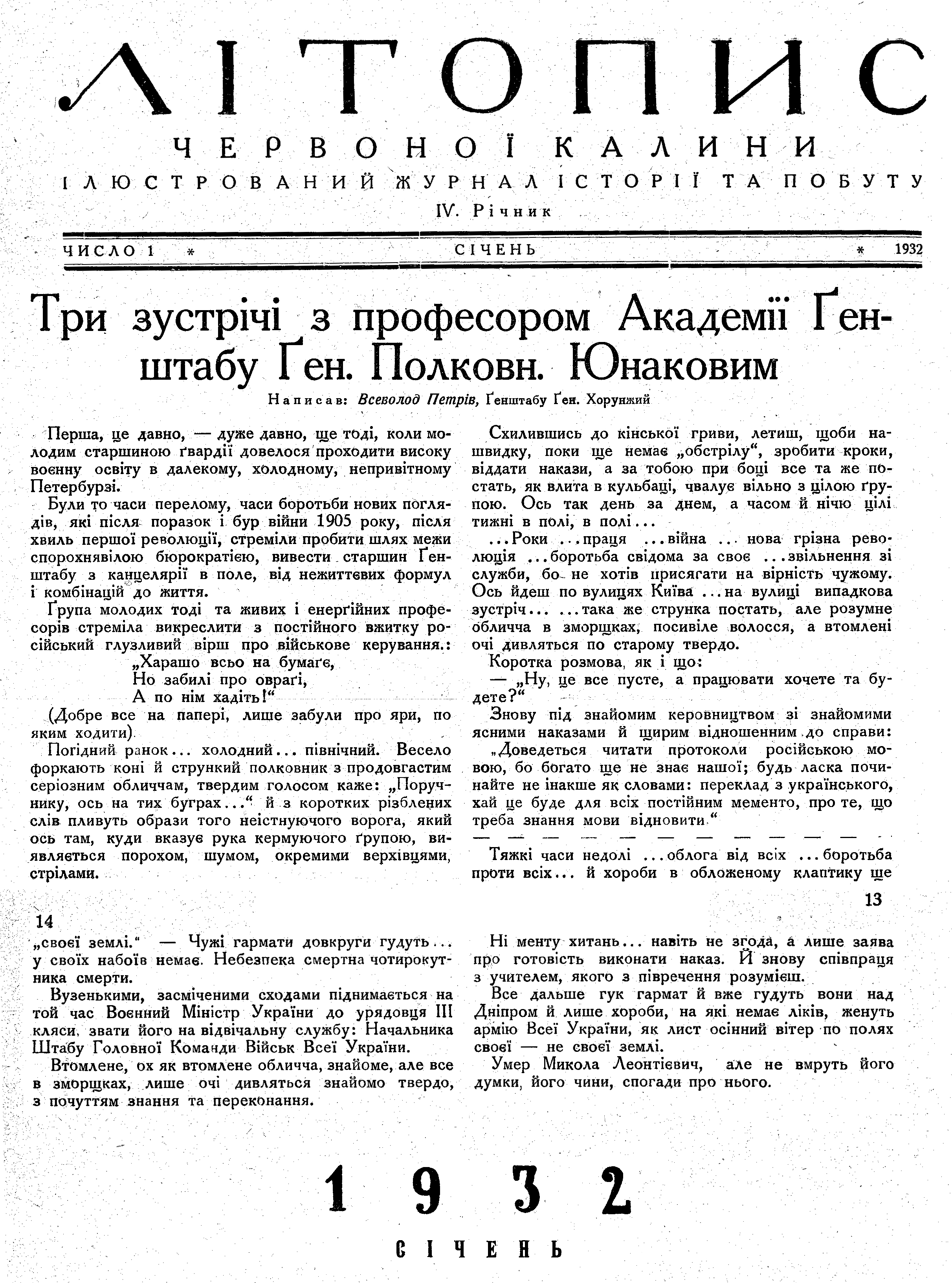 - Петрів В. Три зустрічі з професором Академії Ґенштабу Ґен. Полковн. Юнаковим [Електронний ресурс] / В. Петрів // Літопис Червоної Калини : ілюстрований журнал історії та побуту. Річник ІV. – 1932. – число 1, січень. – С. 13 - 14. – Режим https://avr.org.ua/viewDoc/11731