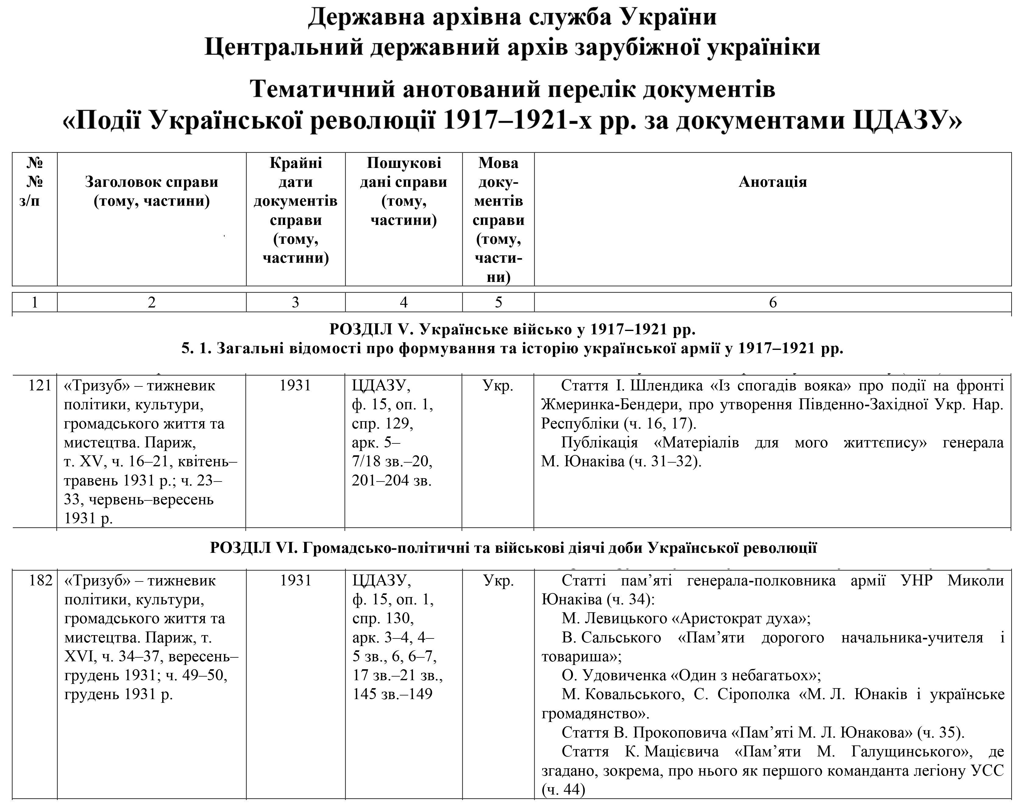 - Тематичний анотований перелік документів. «Події Української революції 1917 – 1921-х рр. за документами ЦДАЗУ» : [Публікація «Матеріалів для мого життєпису» генерала М. Юнаківа (ч. 31–32). Статті пам’яті генерала-полковника армії УНР Миколи Юнаківа (ч. 34-35)] [Електронний ресурс] / укладач : Романова К. В. ; Державна архівна служба України ; Центральний державний архів зарубіжної україніки. – Київ – 2017. – С. 38, 50. – Режим доступу : https://tsdazu.archives.gov.ua/wp-content/uploads/2019/03/Nauk_dovid_aparat/Ukr_revolucia.pdf