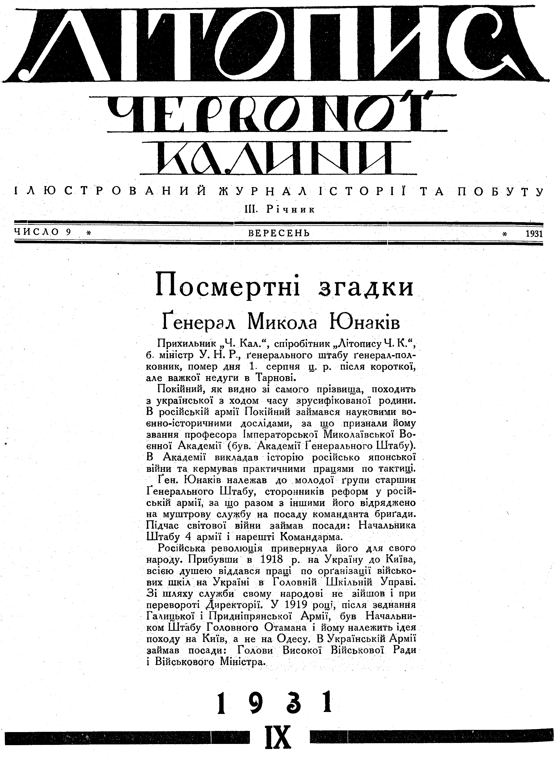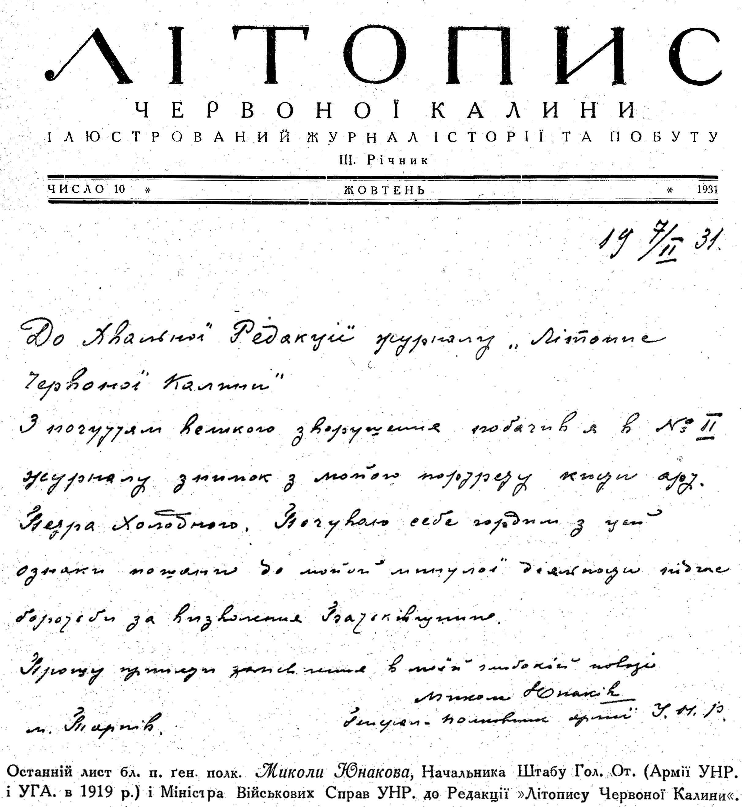 - Останній лист бл. п. ген. полк. Миколи Юнакова, Начальника Штабу Гол. От. (Армії УНР. І УГА. В 1919 р.) і Міністра Військових Справ УНР. до Редакції «Літопису Червоної Калини» [Електронний ресурс] // Літопис Червоної Калини : ілюстрований журнал історії та побуту. Річник ІІІ. – 1931. –число 10, жовтень. – С. 1. – Режим доступу : https://avr.org.ua/viewDoc/11728