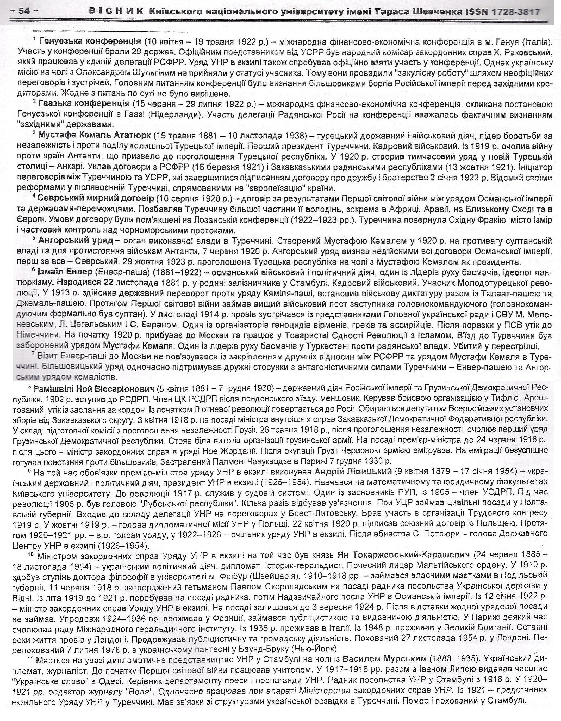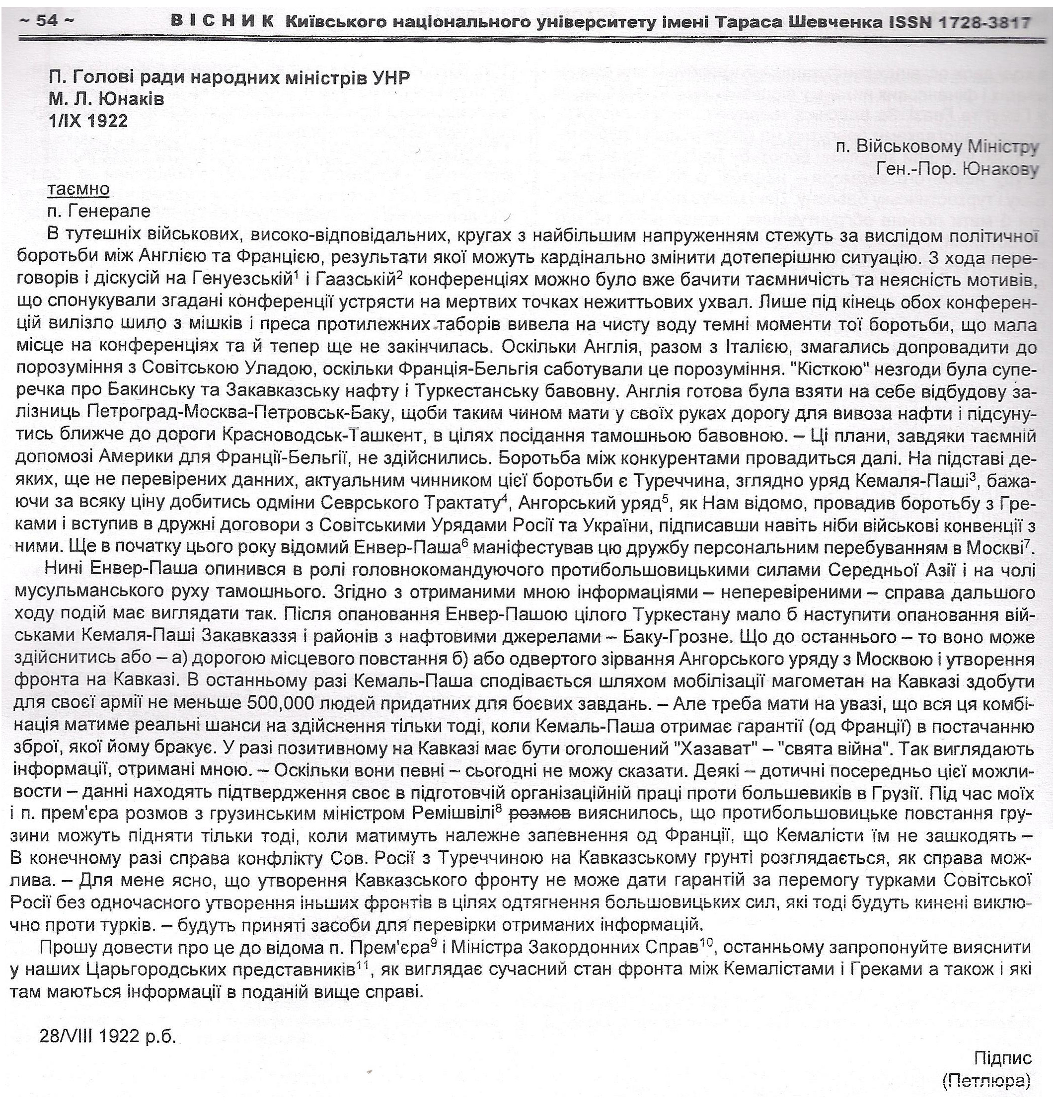- Шевченко В. Лист головного отамана Симона Петлюри до військового міністра Миколи Юнаківа / В. Шевченко // Вісник Київського національного університету імені Тараса Шевченка. Історія. – 2018. – № 2 (137). – С. 52 – 56.