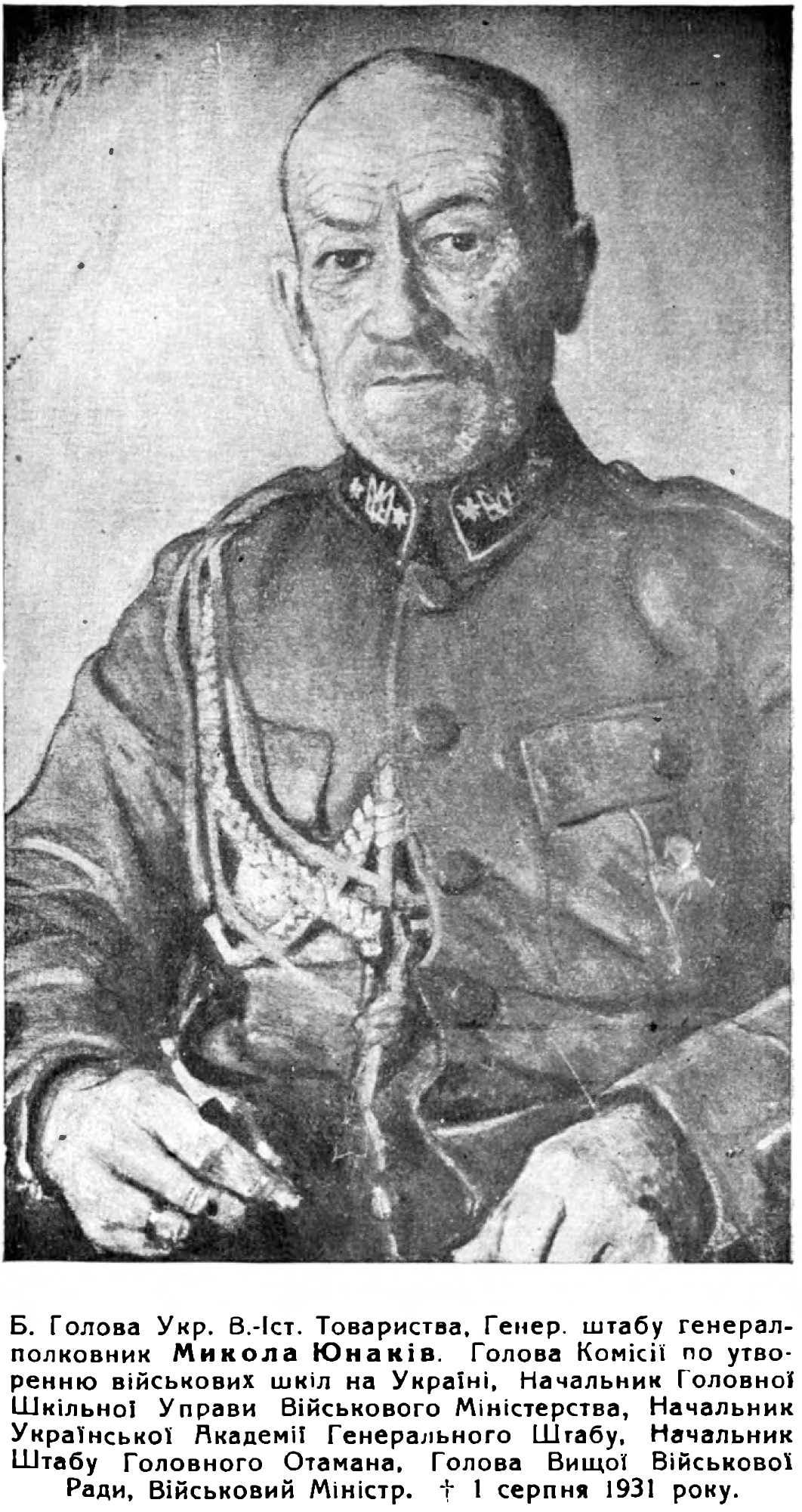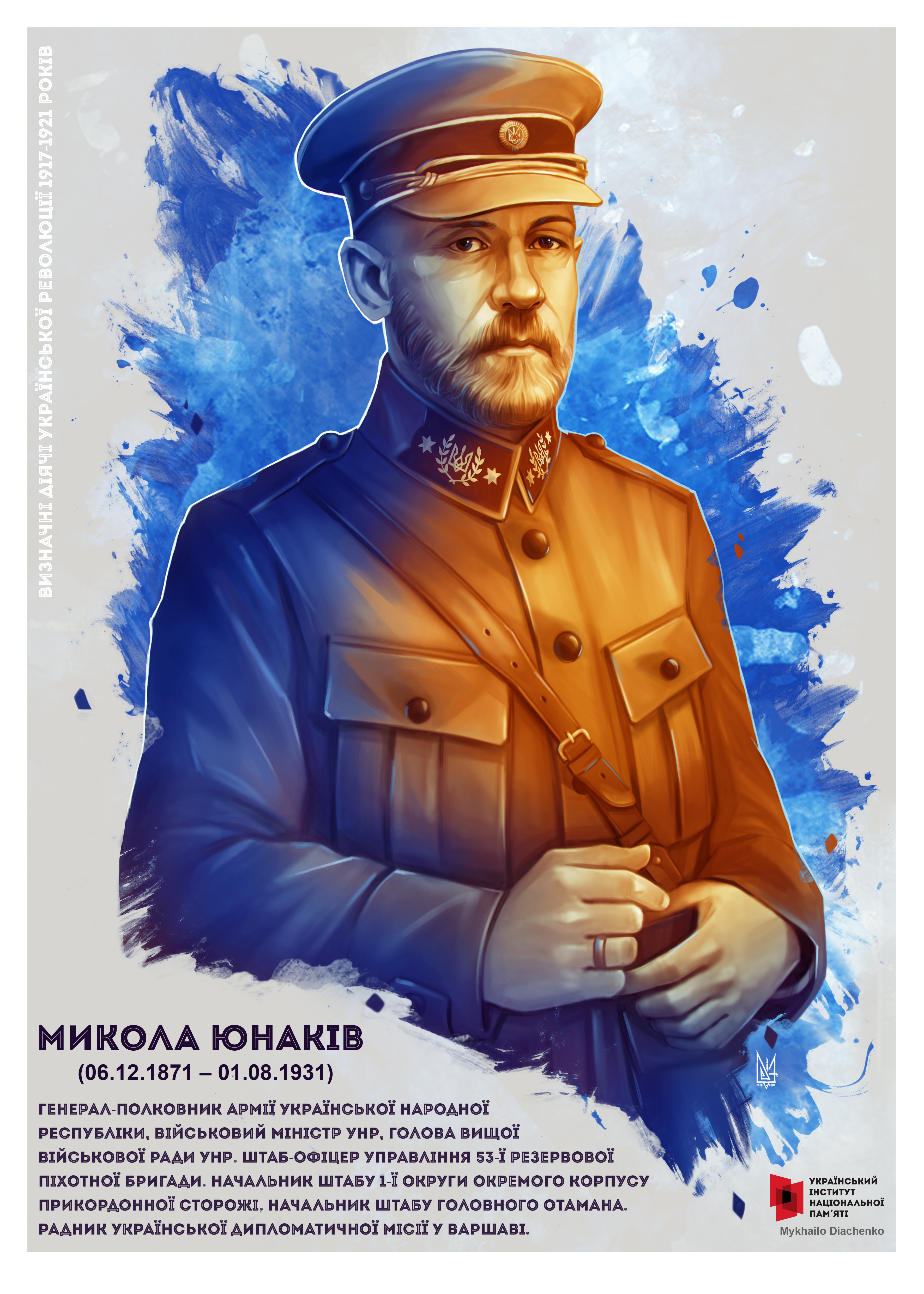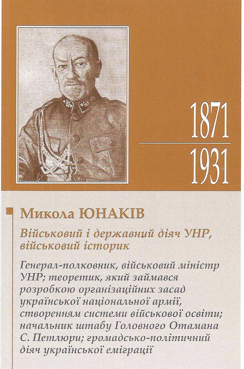 Юнаків (Юнаков) Микола Леонтійович (06.12.1871, м. Чугуїв на Харківщині – 01.08.1931, м. Тарнов, Польща) – генерал-полковник Армії Української Народної Республіки, військовий міністр УНР, Голова Вищої Військової ради УНР, начальник штабу Головного отамана об’єднаних українських армій УНР і ЗУНР, радник Української дипломатичної місії у Варшаві, військовий історик.