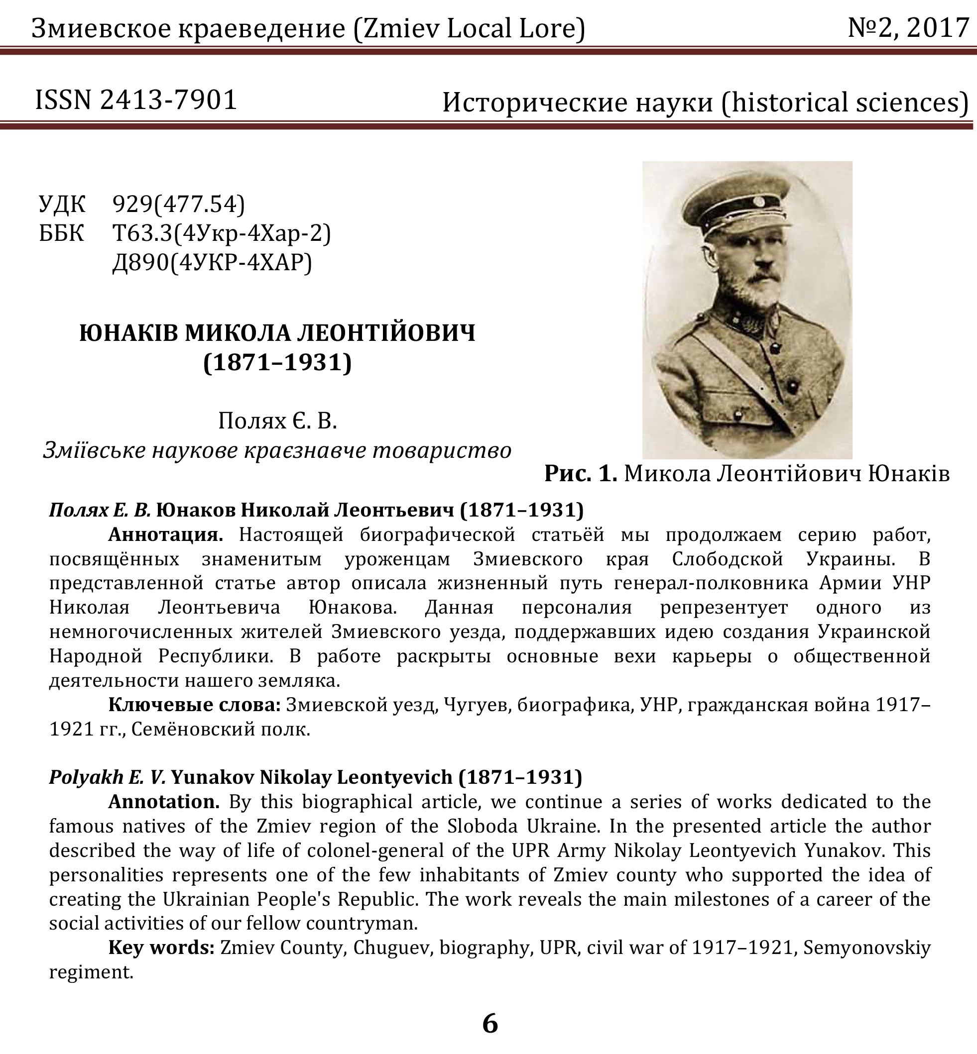 - Полях Є. В. Юнаків Микола Леонтійович (1871–1931) [Електронний ресурс] / Є. В. Полях // Зміївське краєзнавство : електронний науковий журнал / Зміївське наукове краєзнавче товариство. – 2017. – № 2. – С. 6 – 8. – Режим доступу : http://zslls.esrae.ru/pdf/2017/2/3.pdf