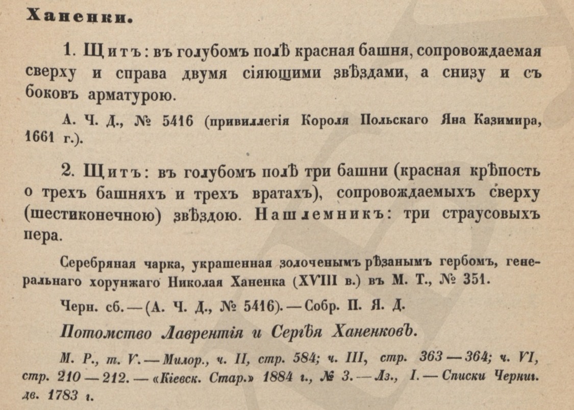 - Ханенко Н. Д. Дневник генерального хорунжего Николая Ханенка. 1727–1753 г. / Н. Д. Ханенко. - Киев, 1884. - XV, 524 с. - Приложение к журналу «Киевская старина»