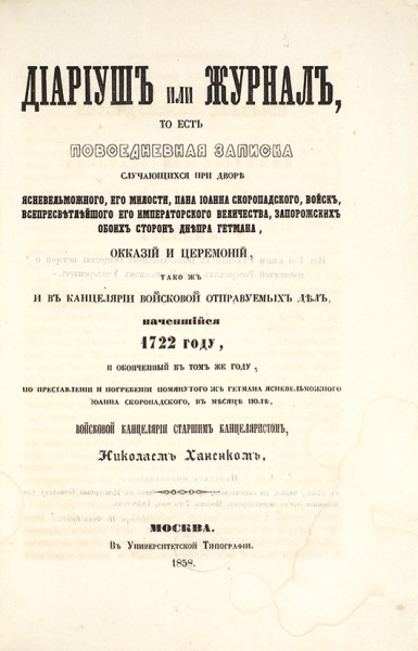 - Ханенко Н. Д. Диариуш, или Журнал, то есть повседневная записка случающихся при дворе ясневельможного, его милости, пана Иоанна Скоропадского, войск, всепресветлейшего его императорского величества, запорожских обоих сторон Днепра гетмана, окказий и церемоний тако жь и вь канцеляріи войсковой отправуеміх дель, наченшийся 1722 году и оконченный в том же году по преставлении и погребении упомянутого гетмана Иоанна Скоропадского, в месяце июле, войсковой канцелярии старшим канцеляристом Николаем Ханенком / Н. Д. Ханенко. - Москва : Университетская типография, 1858. - XXI, 74 с.