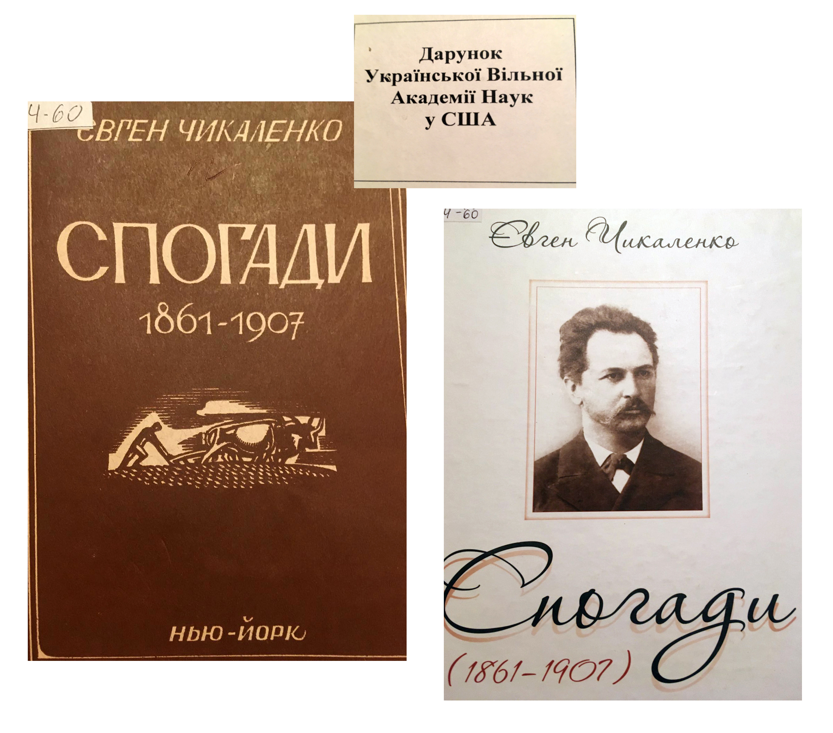 Чикаленко, Євген. Спогади (1861-1907) / Євген Чикаленко ; передм. Володимира Дорошенка ; обкладинка П. Холодного ; портр. автора С. Мако ; видано Укр. Вільною акад. наук у США і Наук. т-вом ім. Шевченка в Америці за матер. допомогою Східньо-Европ. фонду. – Нью-Йорк, 1955. – 502, [2] с. : портр.