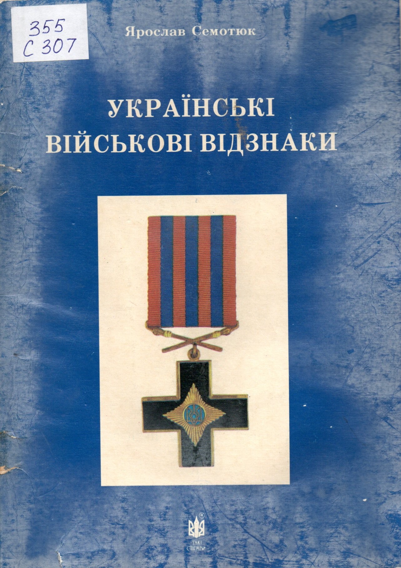 - Семотюк Я. Українські військові відзнаки: ордени, хрести, медалі та нашивки / Я. Семотюк ; Наук. т‑во ім. Шевченка в Канаді. – Київ ; Торонто : Такі справи, 1991. – 51 с. : фот. – (Наук. т‑во ім. Шевченка в Канаді ; т. 34). Шифр : 355/С307