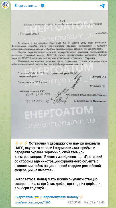 Опромінені окупанти покидають Чорнобиль і Славутич, підписали акт, – Енергоатом // Новинарня. Новини України що воює. – Електронні дані. - Дата публікації :31.03.2022. - Режим доступу: https://novynarnia.com/2022/03/31/opromineni-okupanty/.- Дата звернення: 25.04.2022
