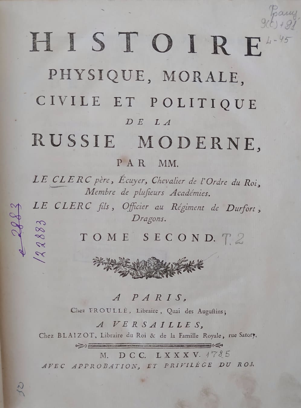 Le Clerc. Histoire physique, morale, civile et politique de la Russie moderne. Т. 2. 1725 - 1763 / LeClerc. - Paris : Versailles: Froulle, 1785. - VIII, 619 p.