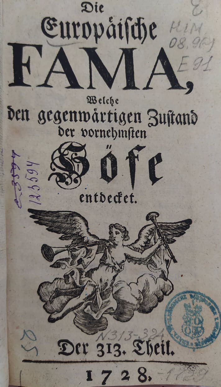 Europäische Fama: welche den gegenwärtigen Zustand der vornehmsten Höfe entdecket. 1728-1729 [Текст] № 313-324. - [S. l. : s. n.], 1729. - 1029, [16] s. : il. - Нім. [готичний шрифт]